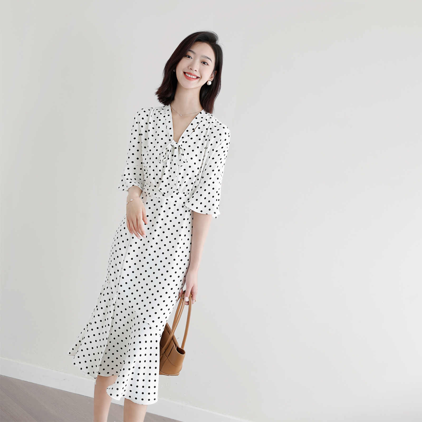 Japan 2022 HBD elegant wavedot fish tail skirt butterfly bow simple V - collar commuter medium - long dress