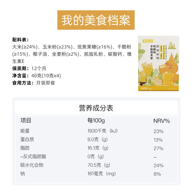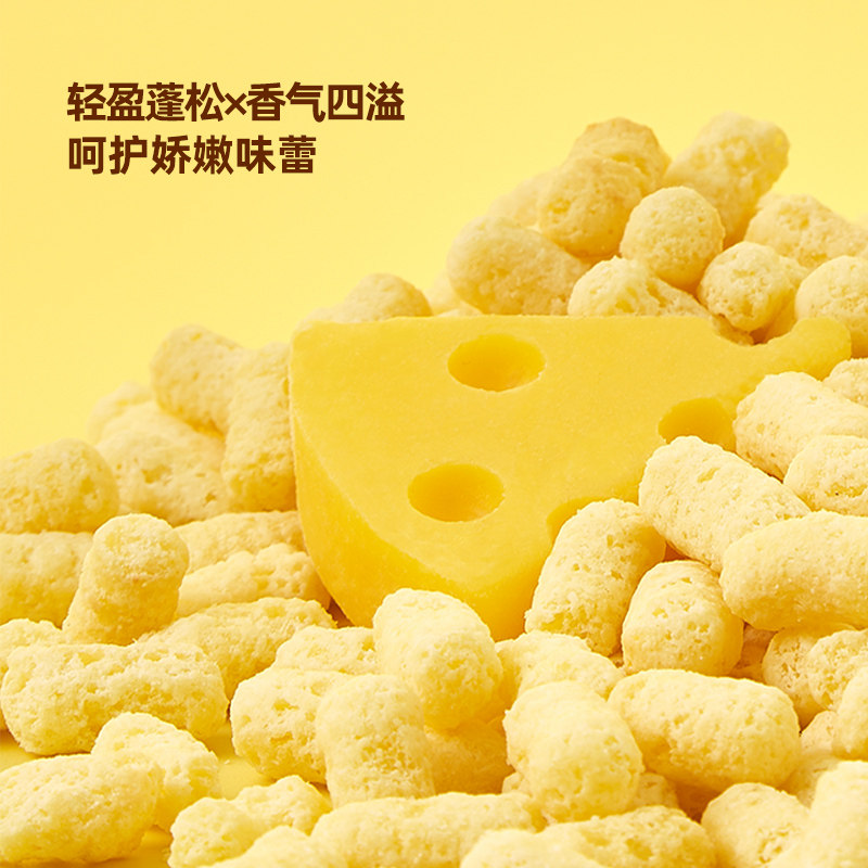 Rice (≥24%)Corn flour (≥23%) Fructose oligosaccharide (≥16%) Cheese powder (≥15%) Coconut oil Whole wheat flour (≥2%) Skim milk powder Calcium carbonate Vitamin E