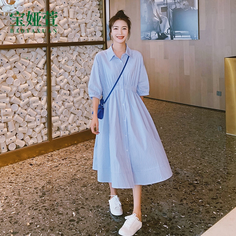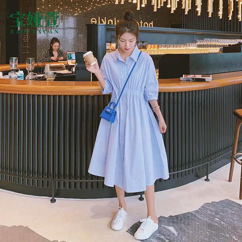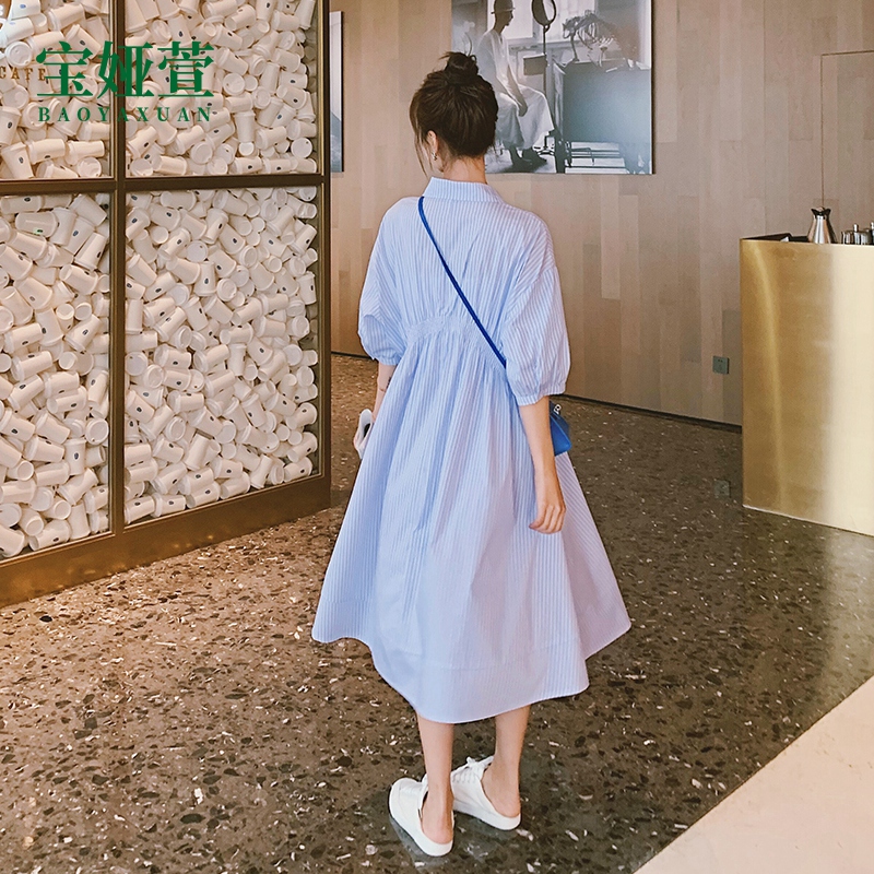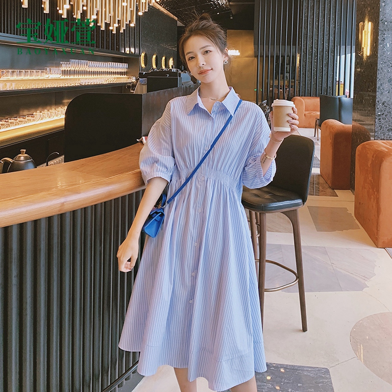 Pregnant Woman Foreign Dress 2021 Summer Pregnant Woman Dress Lactation Small High-end Hot Mother Personality Loose Striped Shirt Dress