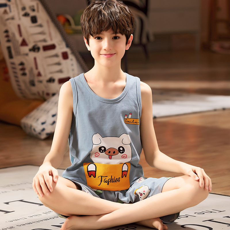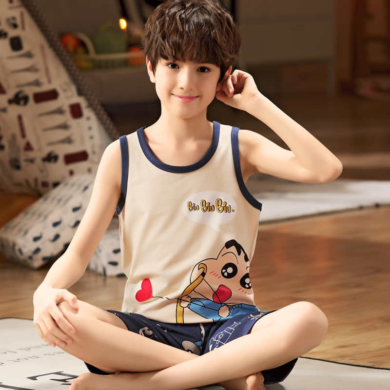 Vest boy summer pyjamas thin section pure cotton children suit children summer clothes cross bar sleeveless shorts suction sweat home conserved-Taobao