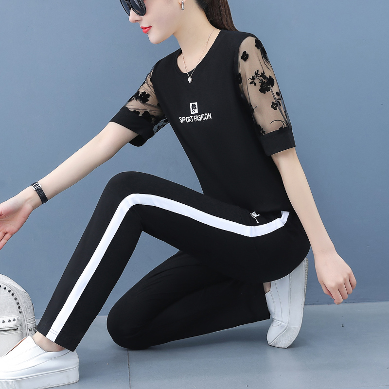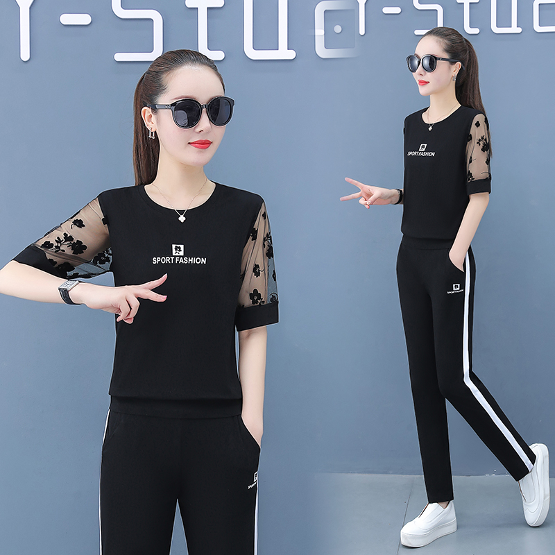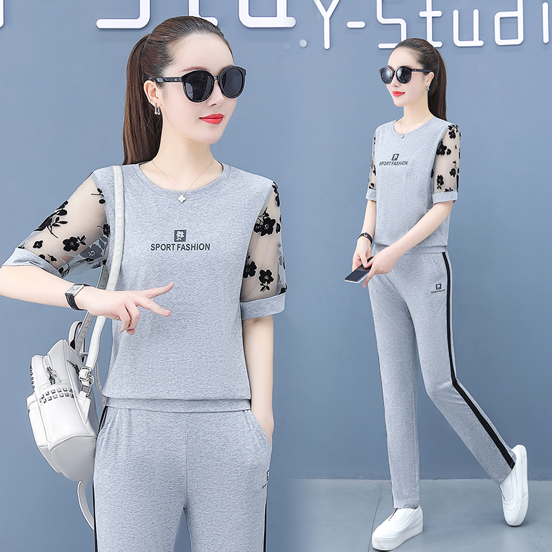 Casual Sports Suit Women's Summer 2022 New Thin models Mom Summer clothing Aging Foreign Pie short sleeves Long pants Two sets