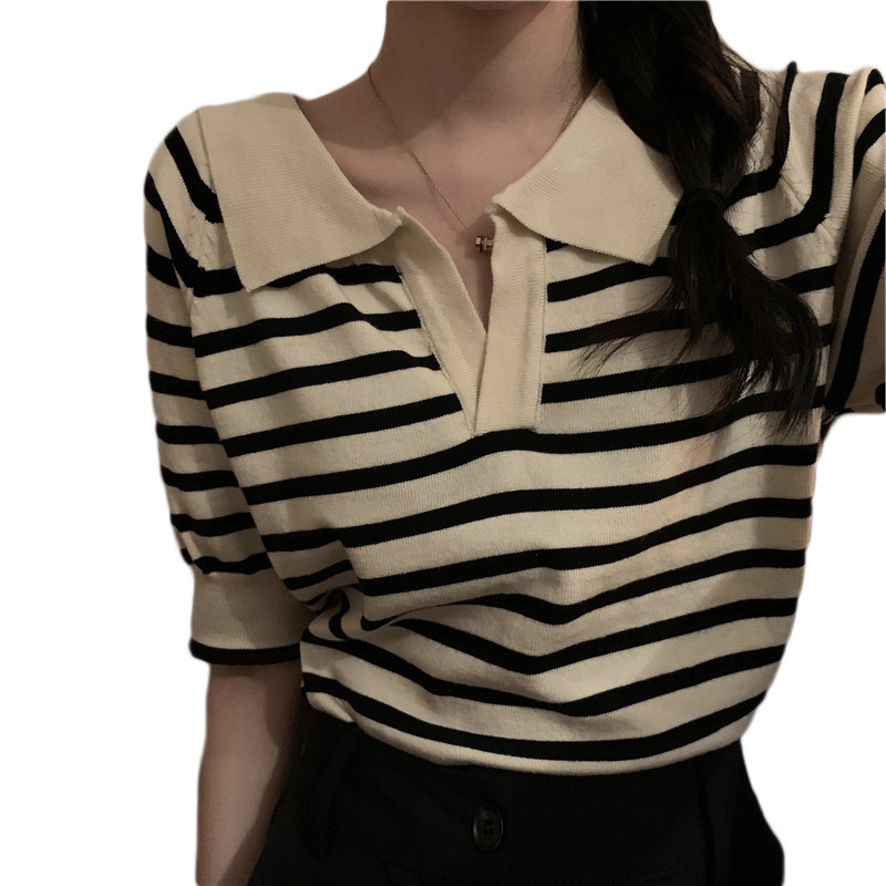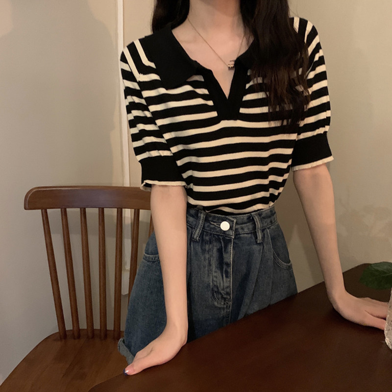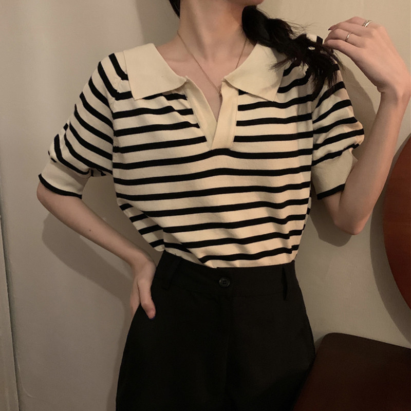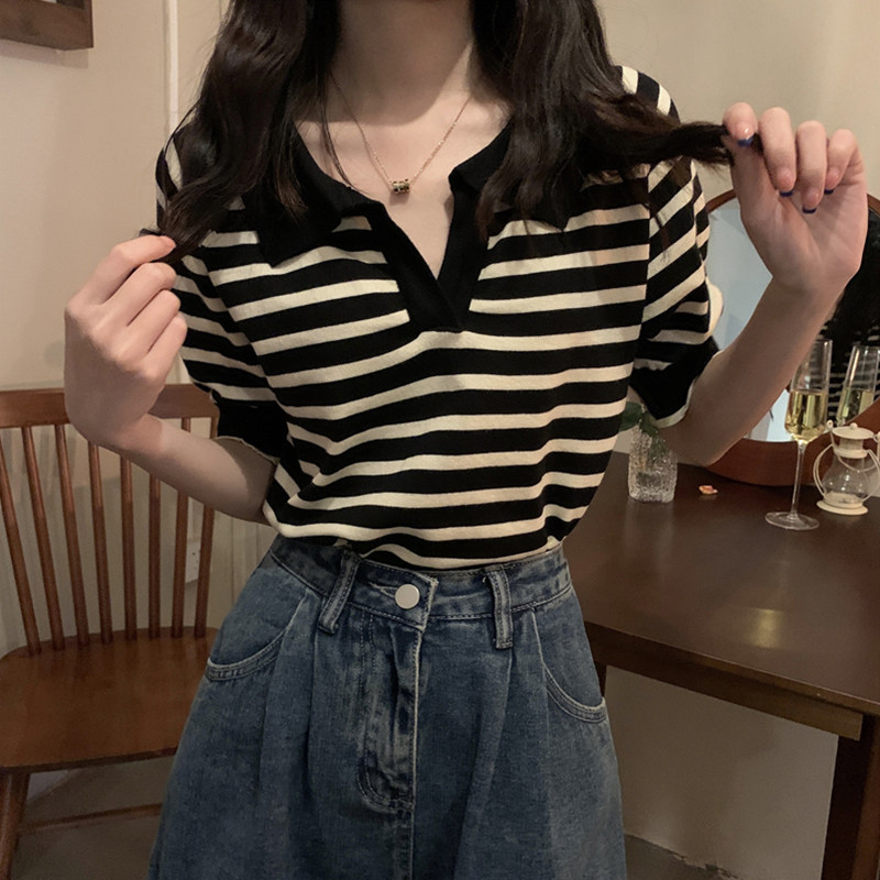 Short sleeve turtlenecks striped T-shirt loose thin section of ice silk-knitted sweatshirt female expats with a small crowdsourced jacket