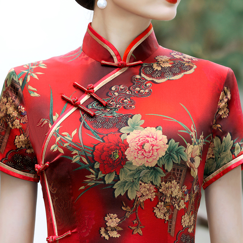 2021 New high-end summer heavy pound mulberry silk young Temperament Print Walking Show Old Shanghai Real Silk Qipao