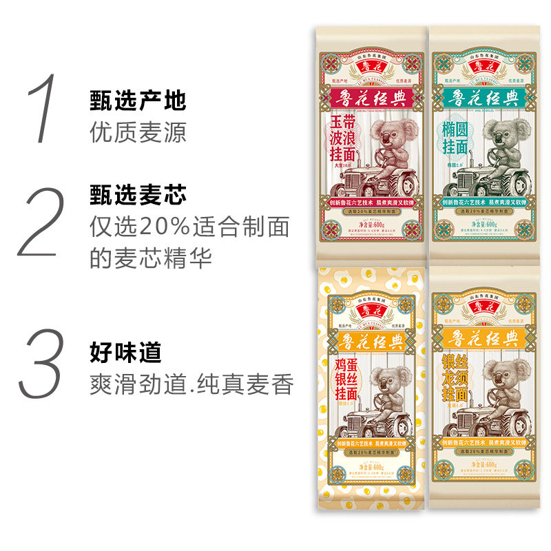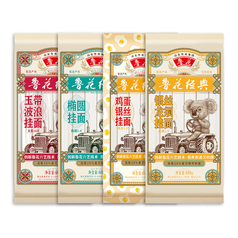 600g Ruflower egg fine hanging noodles * 4 packs 600g Ruflower jade with wave hanging surface * 4 packs 600g Ruflower oval hanging surface * 4 packs 600g silver silk dragons to hang face * 4 packs