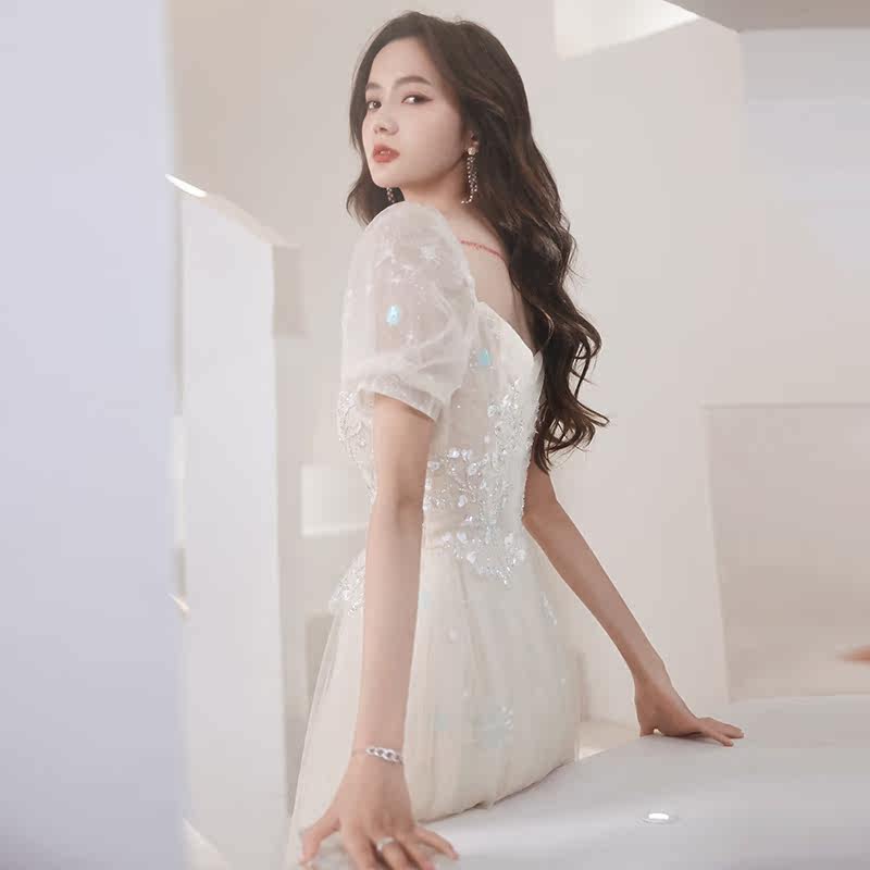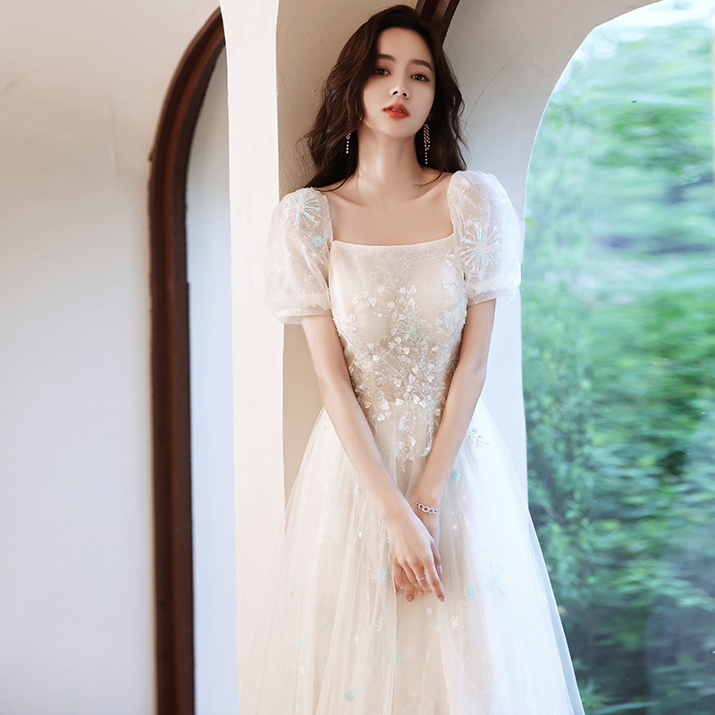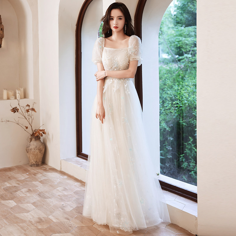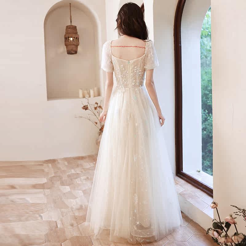 Banquet evening dress skirt female niche high-end light luxury fairy engagement host champagne color bubble sleeve temperament long version