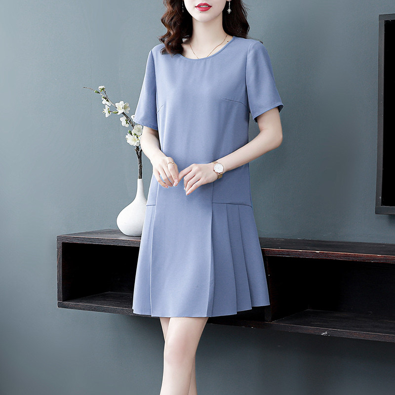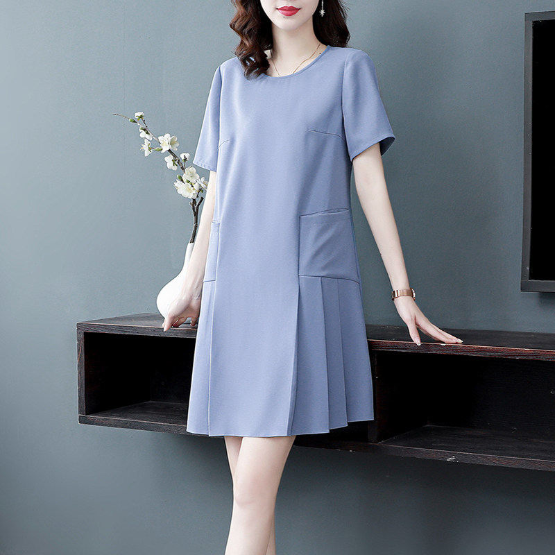 Blue high-end dress female small man 2022 summer new pleated loose simple temperament straight a-line skirt