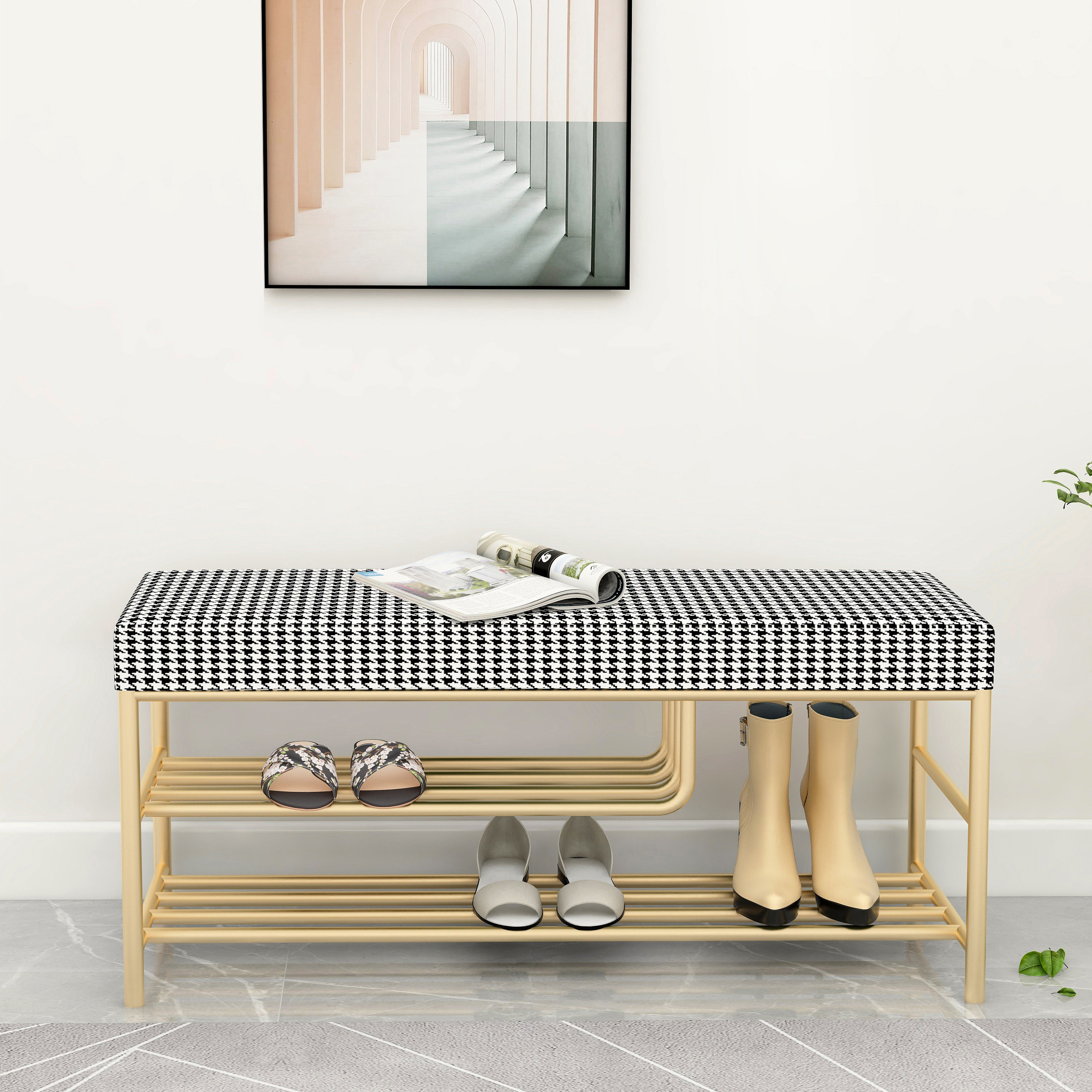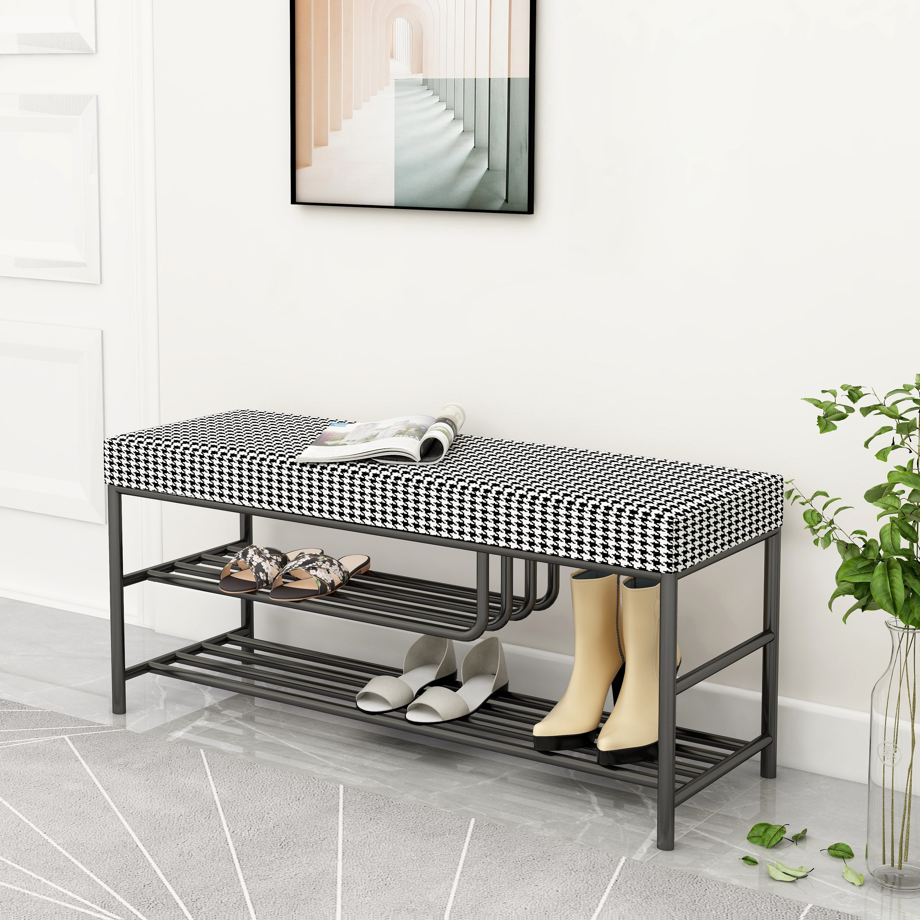 Light luxury houndstooth change shoe stool home door entry shoe cabinet sitting stool integrated into the door can sit on the shoe rack and wear the shoe stool