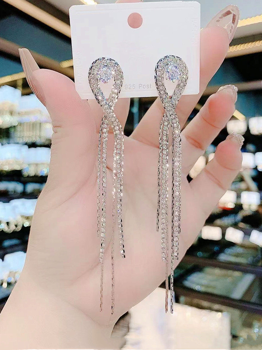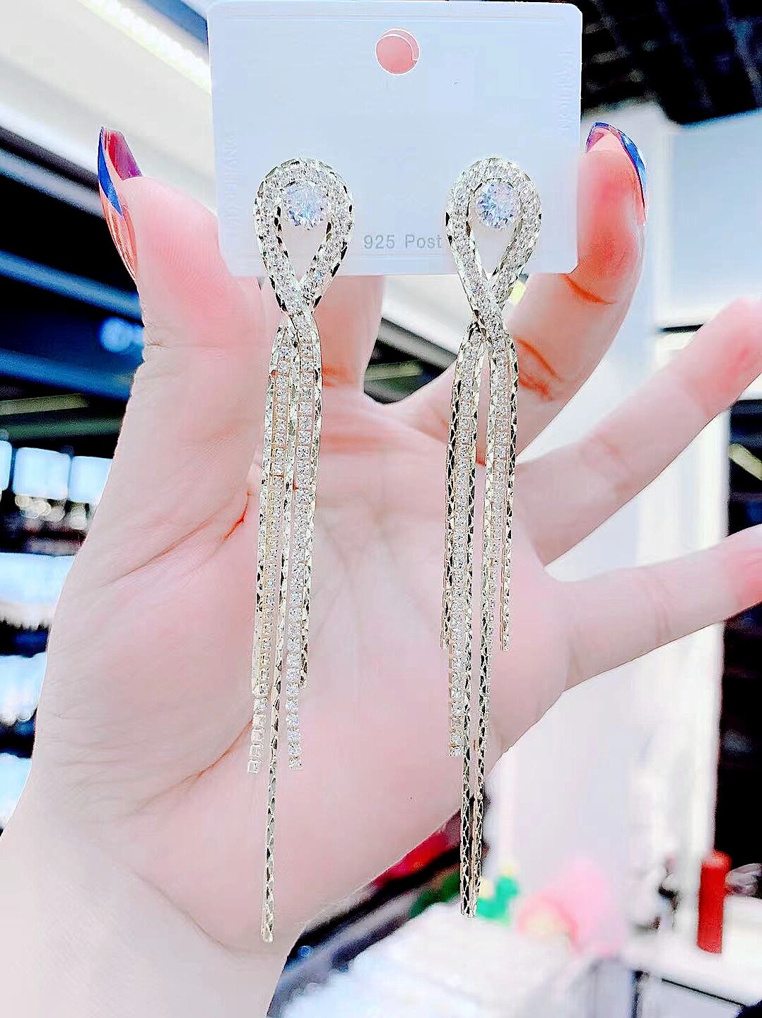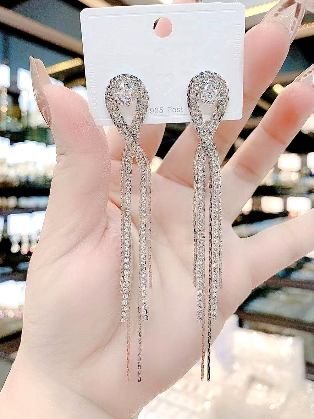 Korean fashion ladies temperament wild silver needle earrings net red super flash zircon rhinestones long version cross tassel earrings