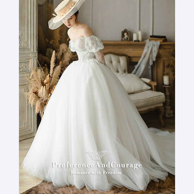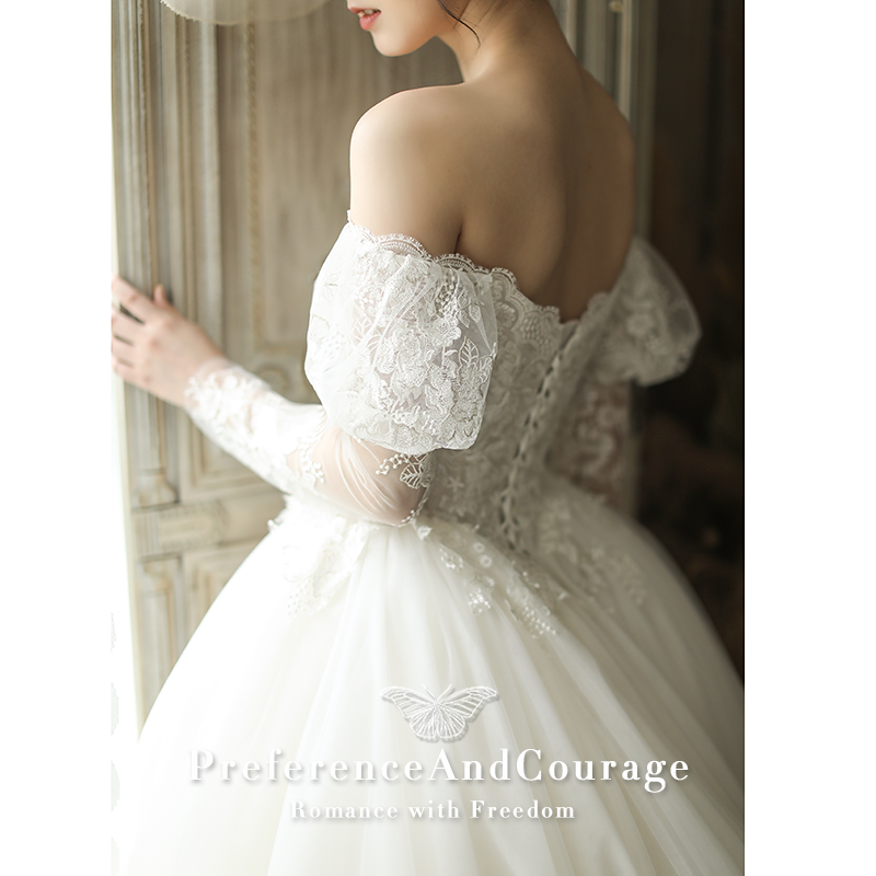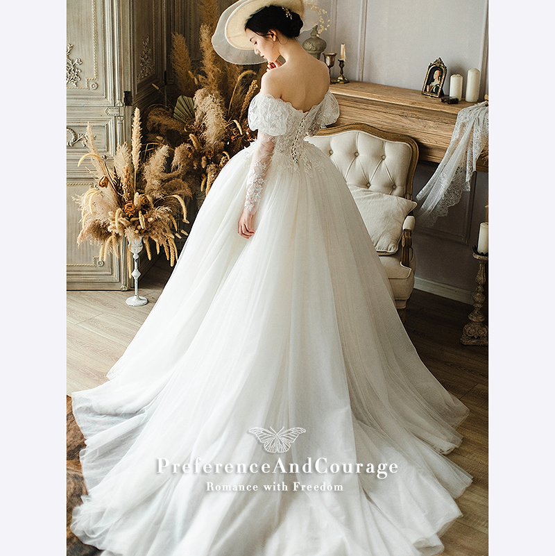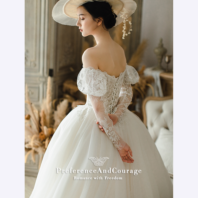 Preference and Courage "Qian Xun" light wedding dress One-shoulder long-sleeved lace Vintage main yarn Advanced texture French style