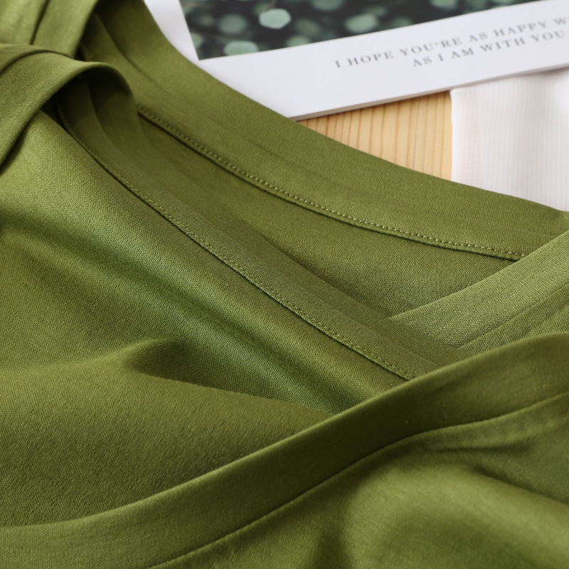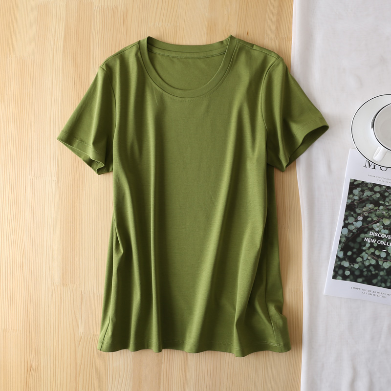80-count mercerized cotton V-neck ice silk short-sleeved T-shirt Amoi women's avocado green pure cotton round neck slimming solid color top