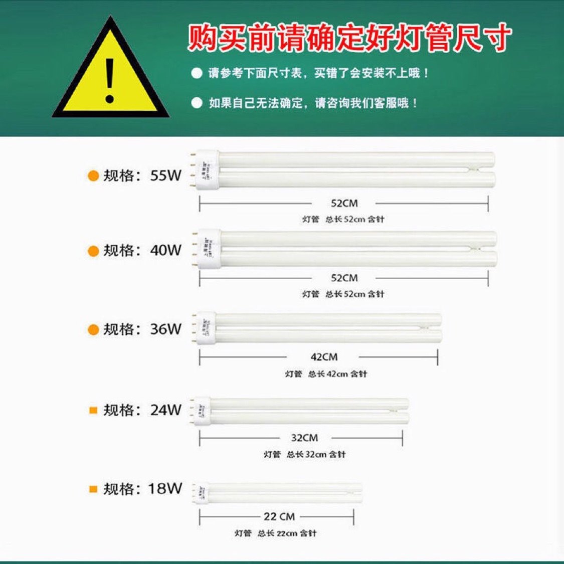 H-shaped lamp holders (2) 18W (length 22cm) special offer 2 sets 24W (length 32cm) special offer 2 sets 36W (length 42cm) special offer 2 sets of 40W (length 52cm)