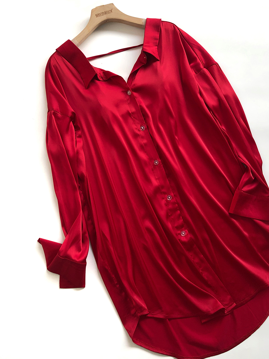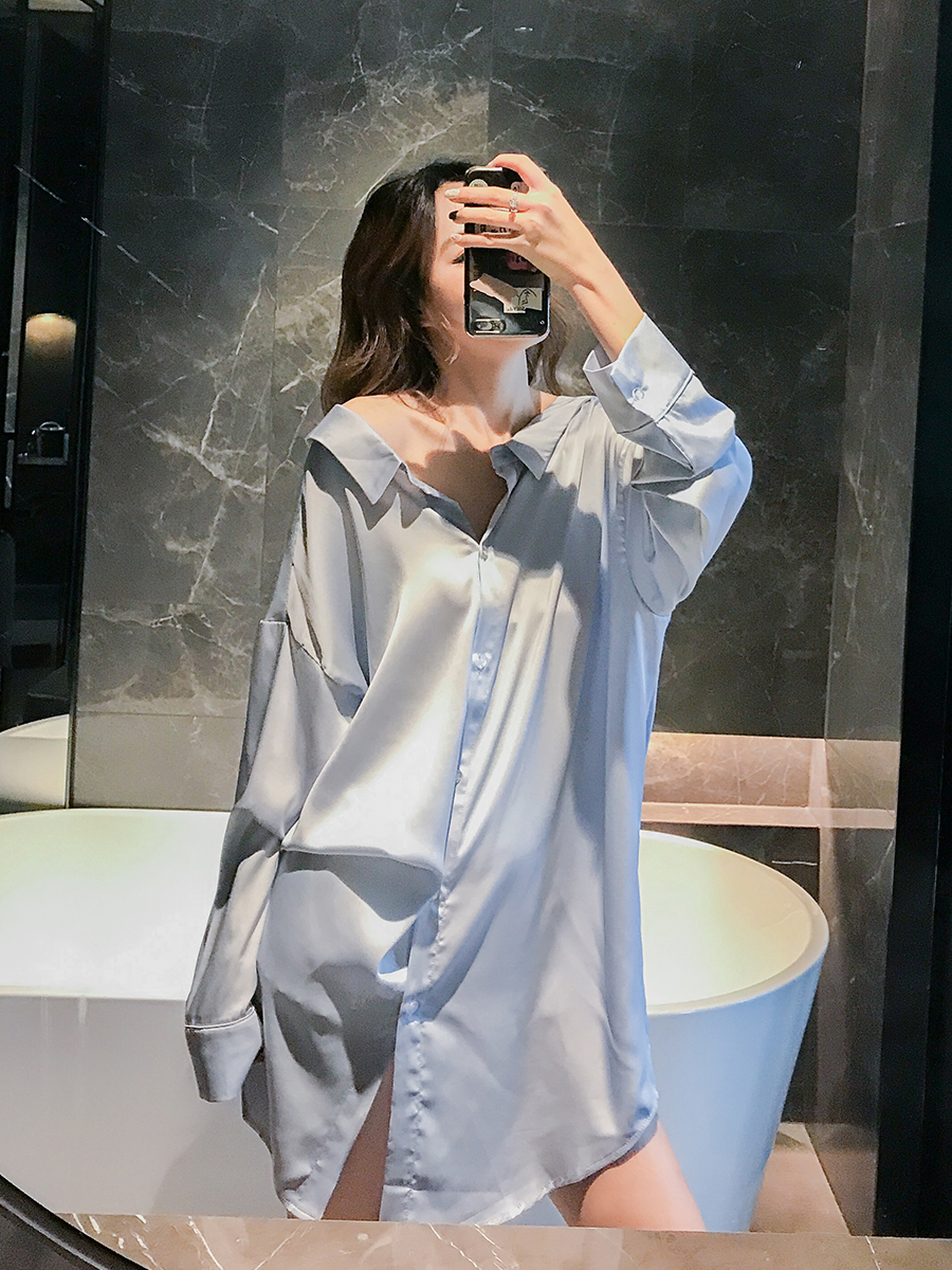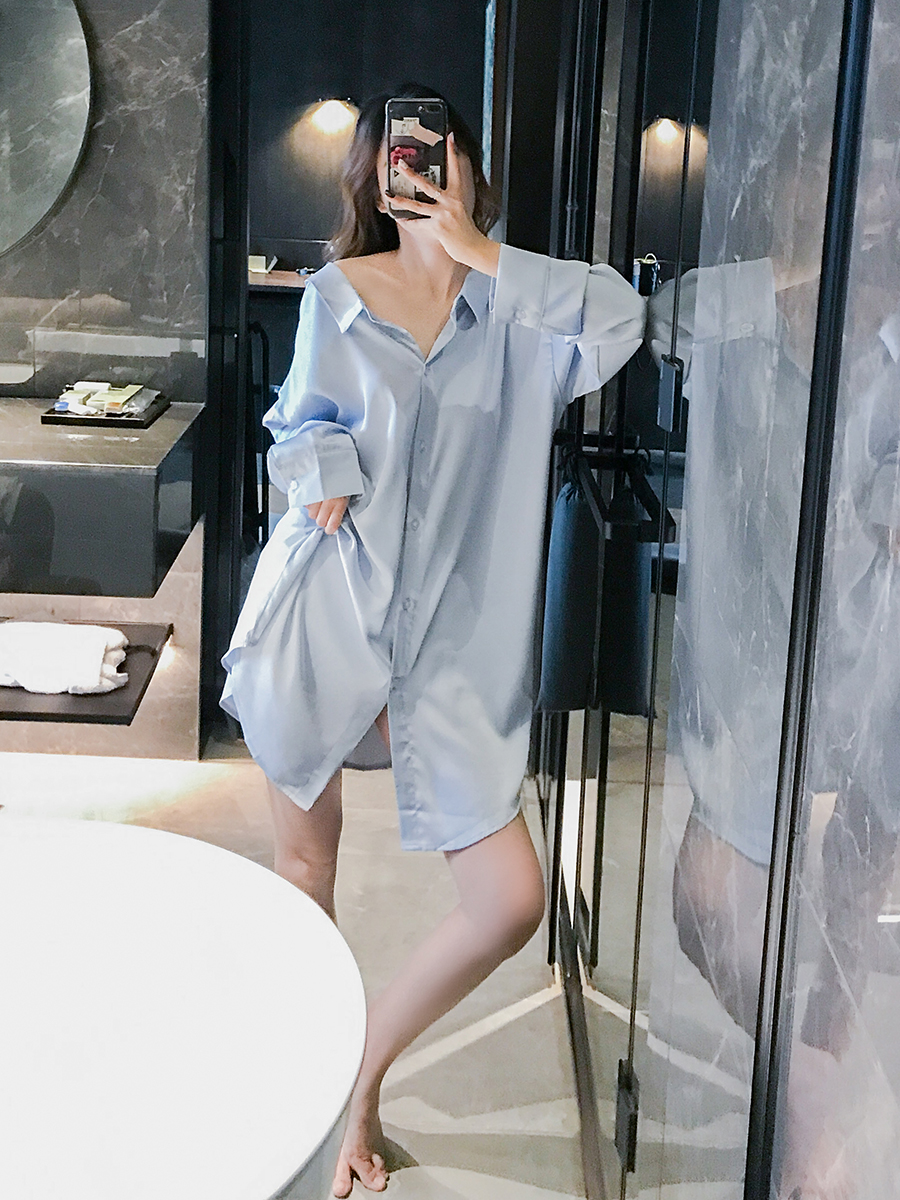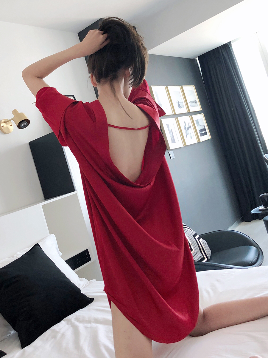 Backless careful machine ~ sexy and provocative boyfriend wind shirt nightgown women Summer Ice Silk explosive medium and long version of pajamas
