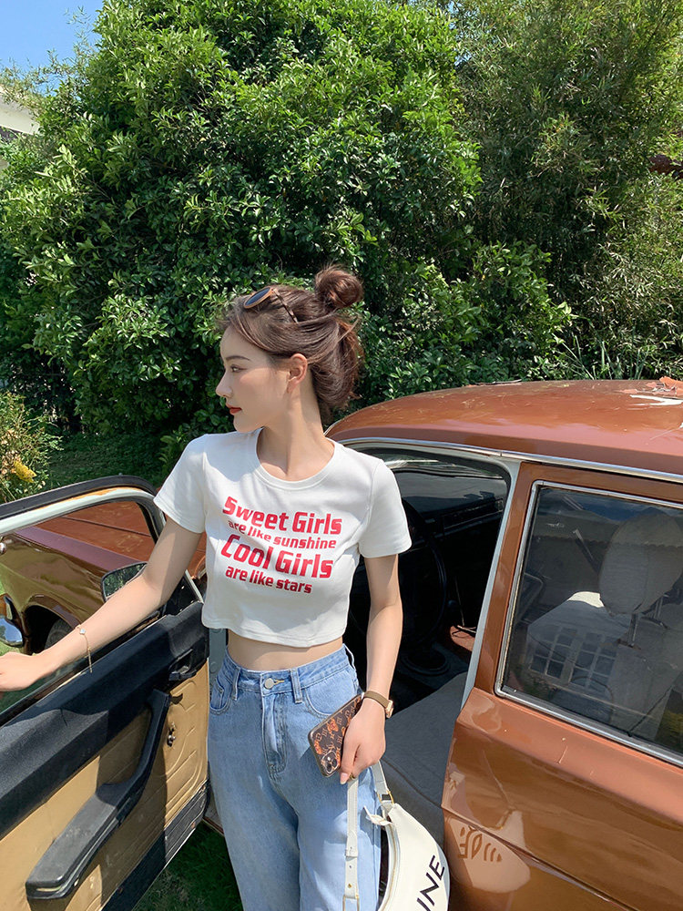 (TWO LEMON Summer Handbook) Spice Girls Short Short Sleeve T-Shirt Female Summer Slim Body Navel White Top