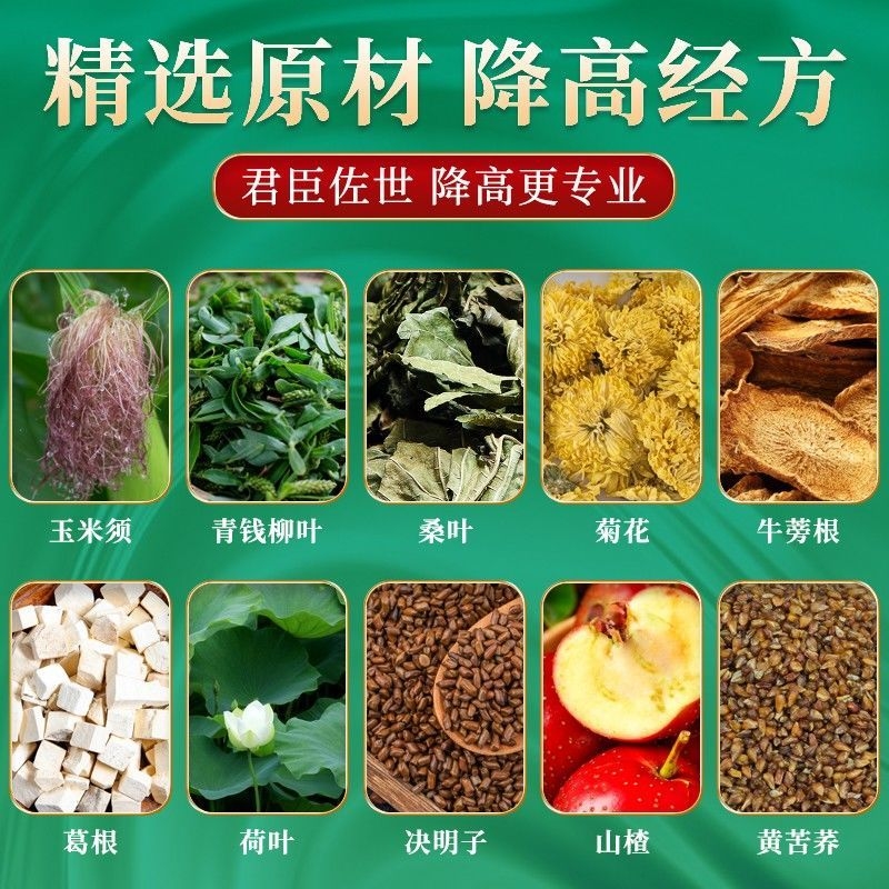 Cassia seed, hawthorn, kudzu root, yellow tartary buckwheat, burdock root, green carnation willow leaf, chrysanthemum flower, lotus leaf and mulberry leaf