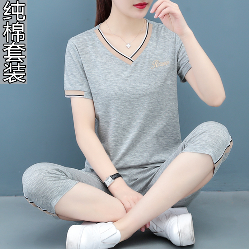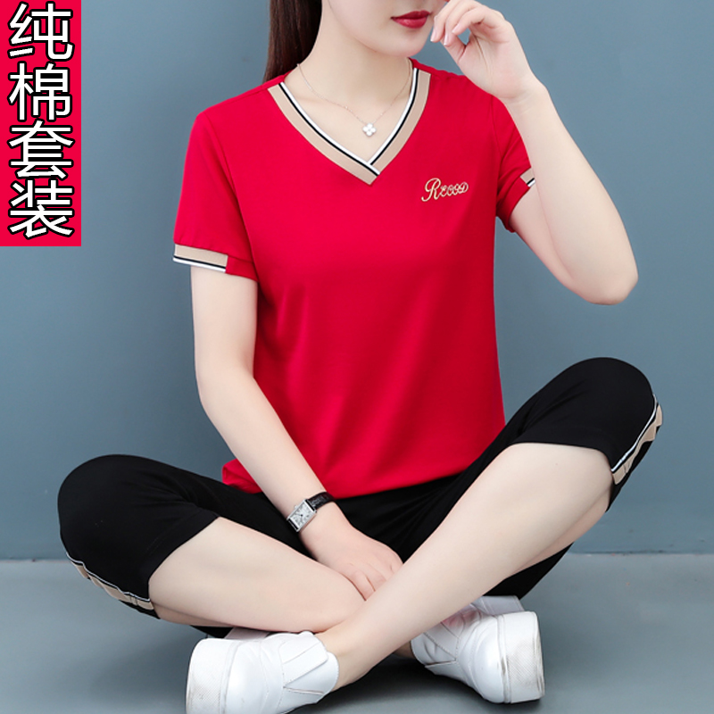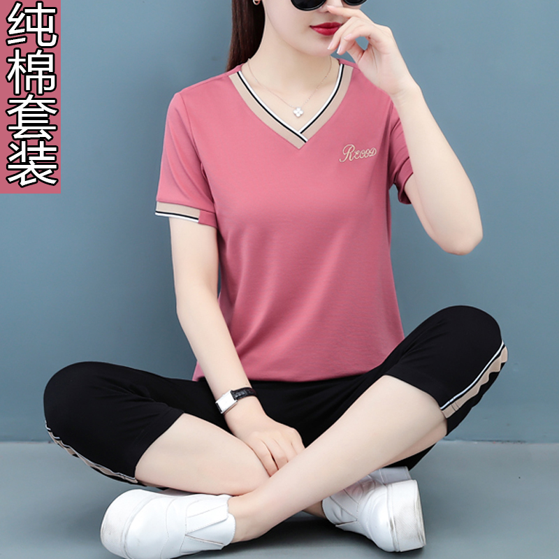 Pure Cotton Sportswear Suit Women's Summer 2021 New V Collar Seven Pants Mom Big Size Casual Two-piece Summer