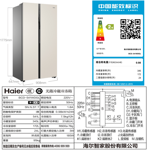 Haier 541L large-capacity two-door air-cooled frost-free dry and wet storage glass door household double inverter refrigerator