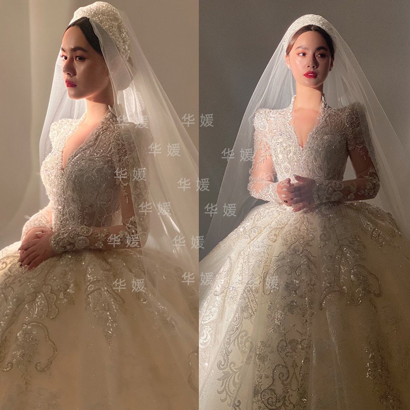 Long-sleeved main wedding dress bride 2021 new big tail actress empty v-neck French light and heavy work princess court
