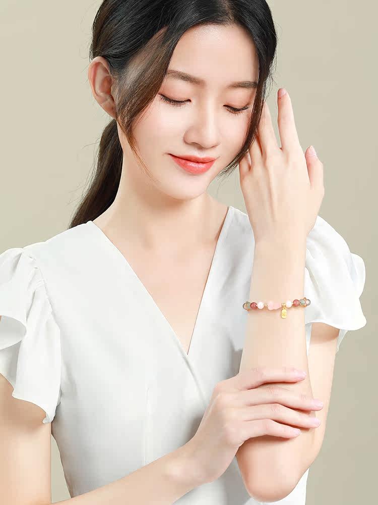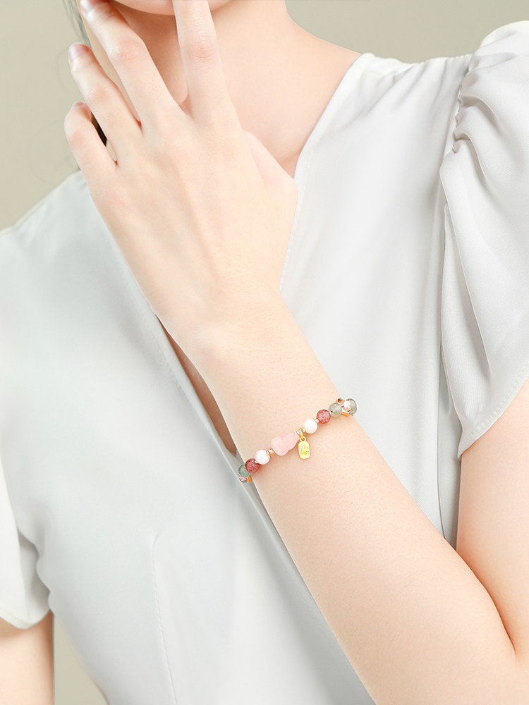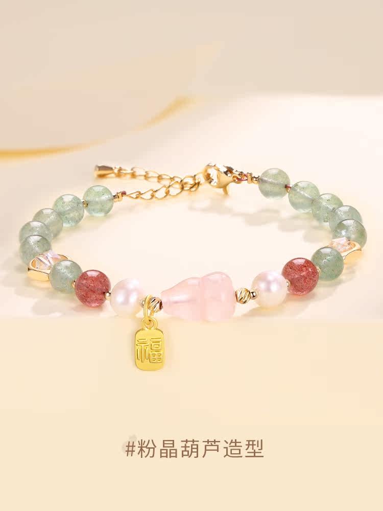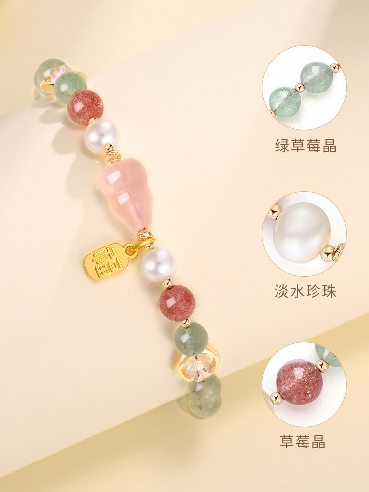 Natural green strawberry crystal blessing word blessing brand bracelet female summer peach blossom powder crystal gourd transfer beads crystal bracelet high-end sense