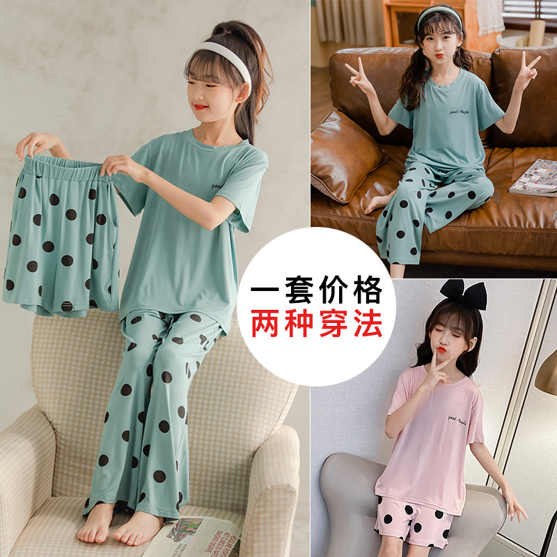 Children's clothing 2022 summer new girls' polka dot pajamas set children's home clothes three-piece girl suit loose