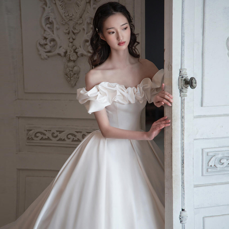 (Muchen) French main wedding dress 2023 new go-out yarn satin court style trailing one-shoulder light wedding dress summer