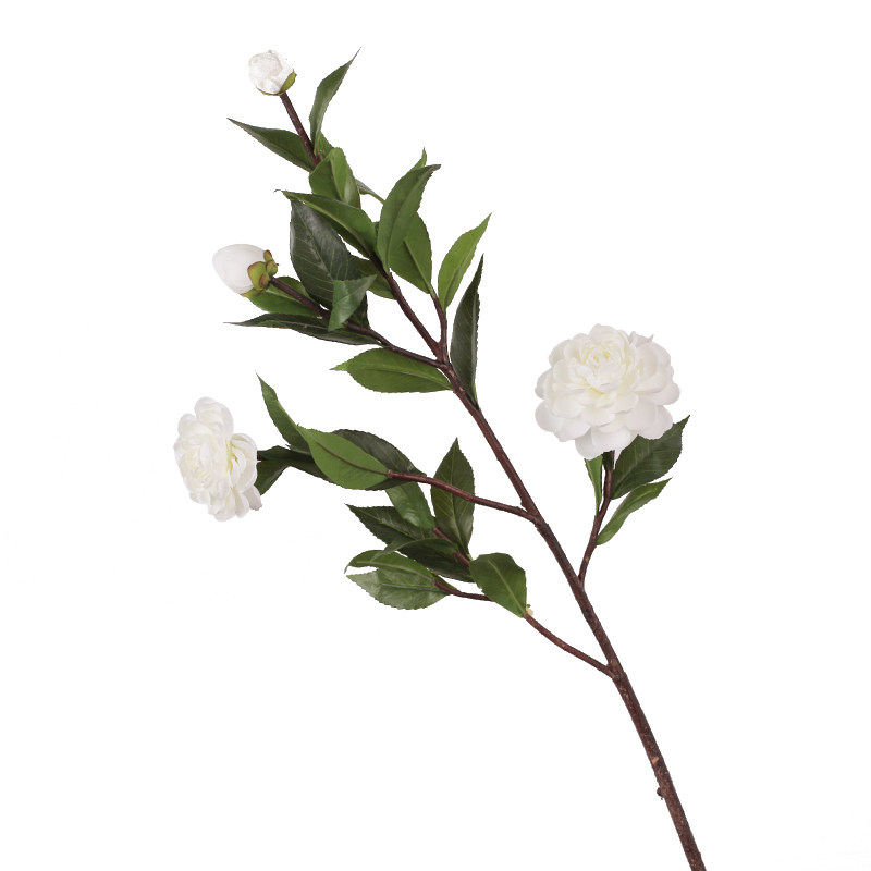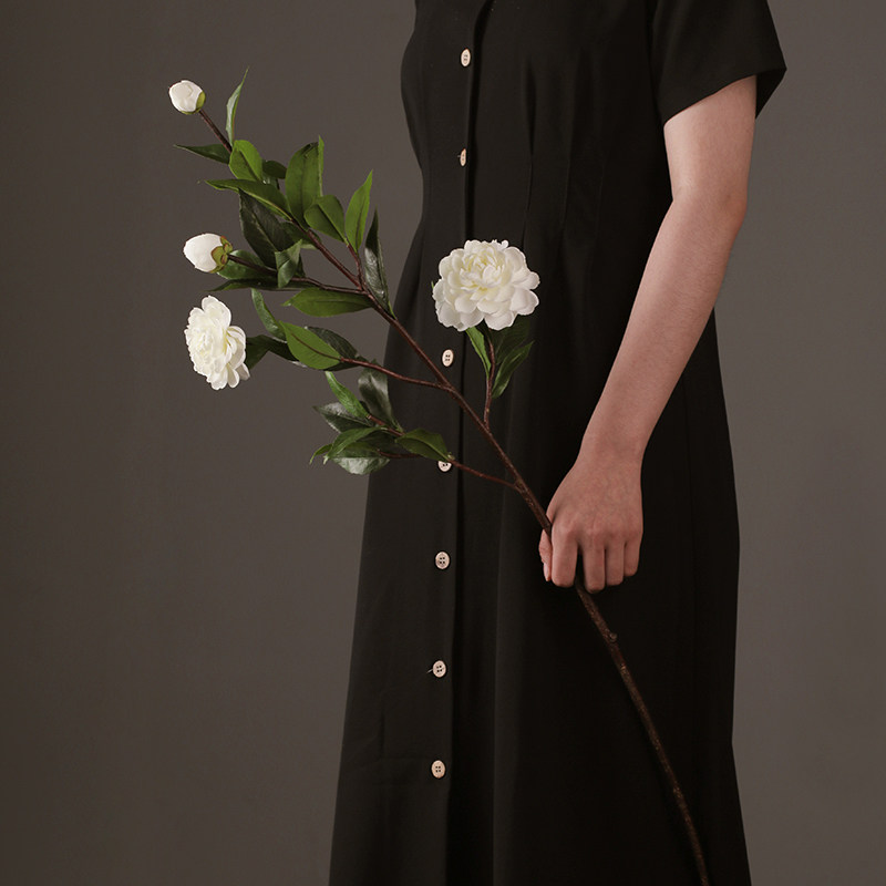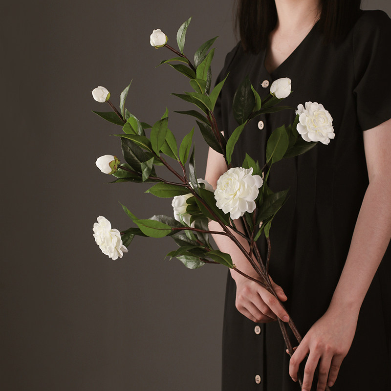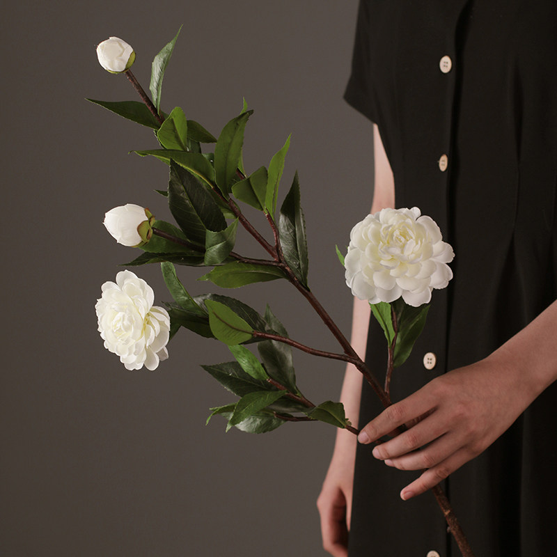 Floor-to-ceiling simulation camellia decorative flower living room TV cabinet high vase arrangement gardenia long branch green leaf fake flower decoration
