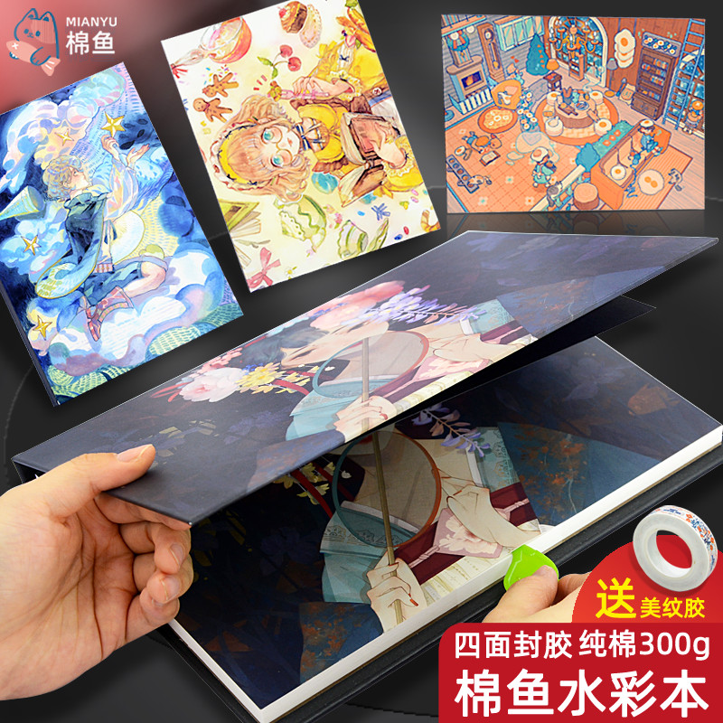 Cotton fish watercolor paper pure cotton thickened 300g grams of fine lines special watercolor paper thread drawing drawing illustration painting 8K16K open cotton pulp paper four-sided sealing rubber travel sketches solid watercolor