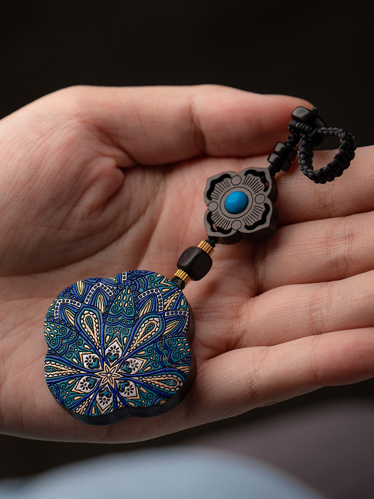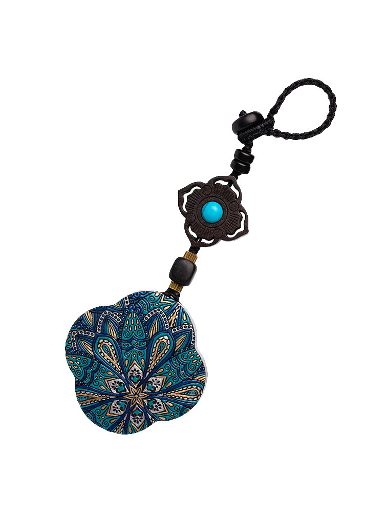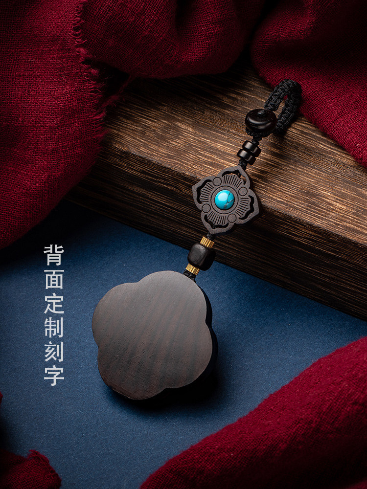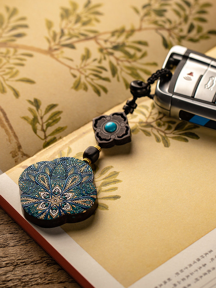 Blue good luck hand-painted four-leaf clover black sandalwood pure silver prajna flower key chain blue good luck hand-painted four-leaf clover lettering black sandalwood pure silver prajna flower key chain lettering Tathagata Dorje four-leaf clover key chain Tathagata Dorje four-leaf