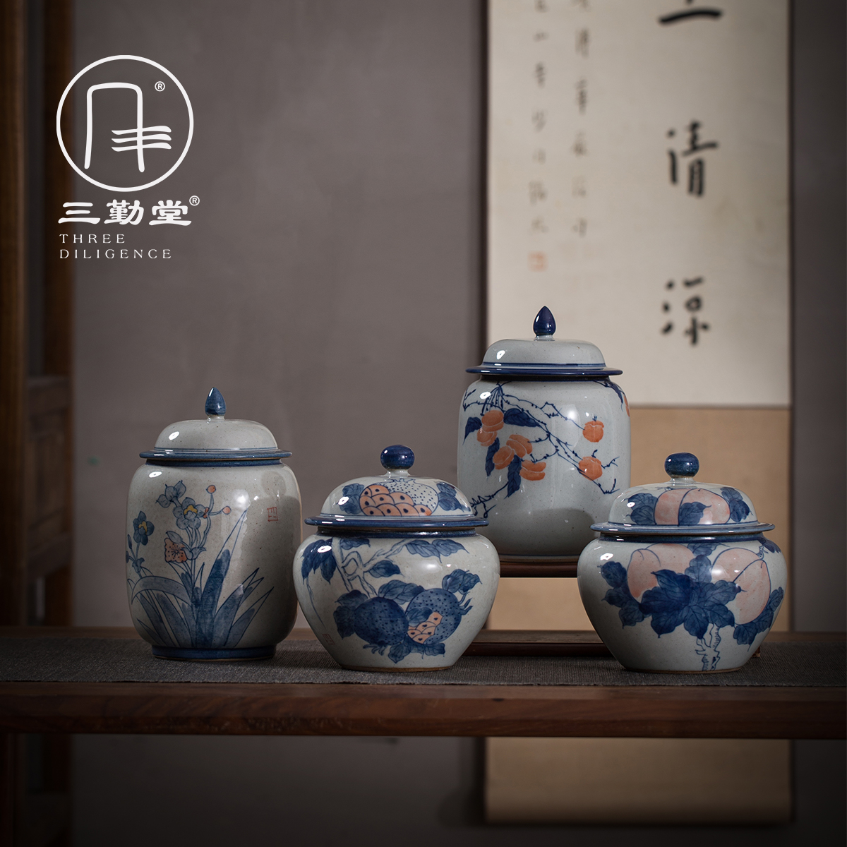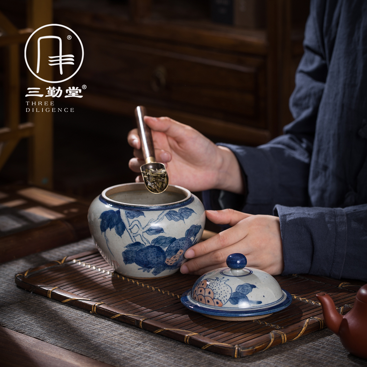 Sanqitang ceramic tea jar blue and white porcelain sealed pot pottery clay glaze hand-painted Jingdezhen tea set tea bin tea can