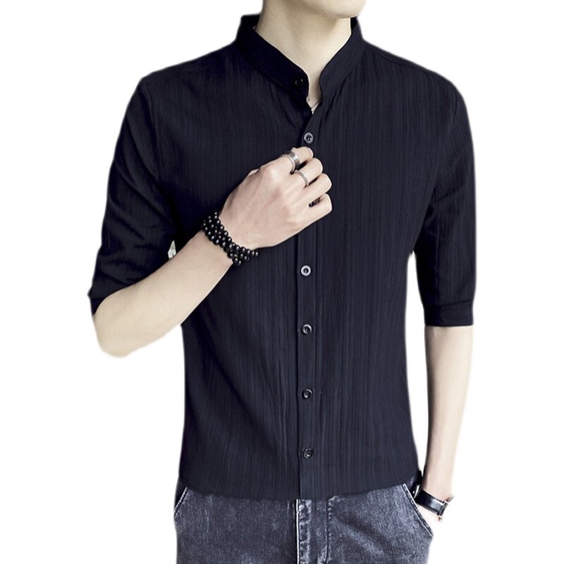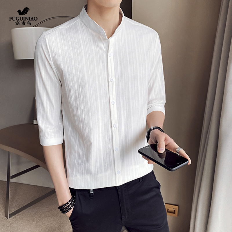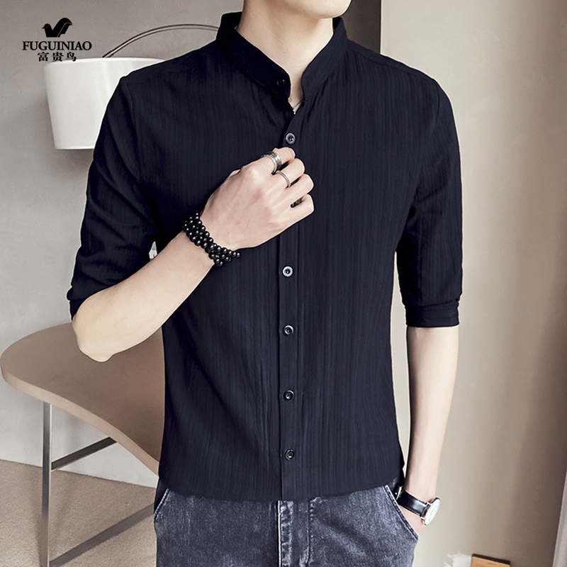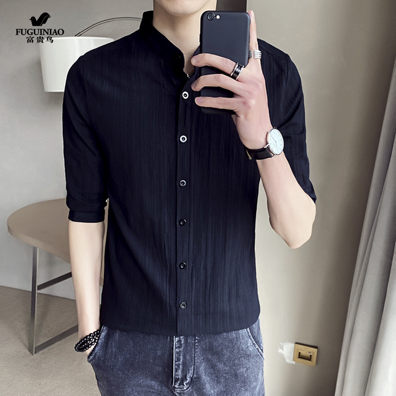 Fugui bird shirt short sleeve men linen pure color striped Korean ruffled 70% sleeves Tide Summer Advanced Sensation
