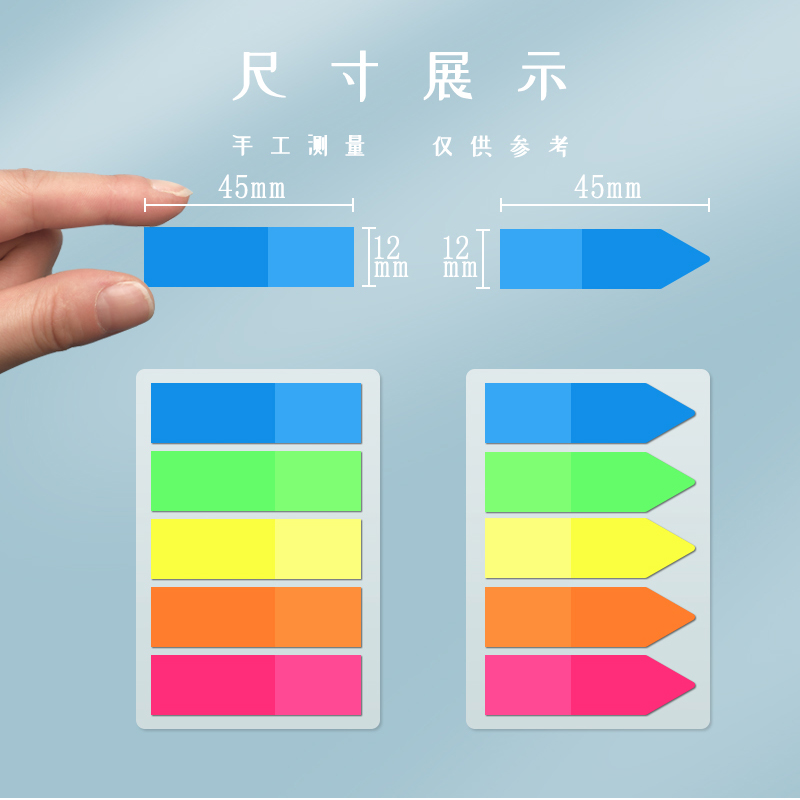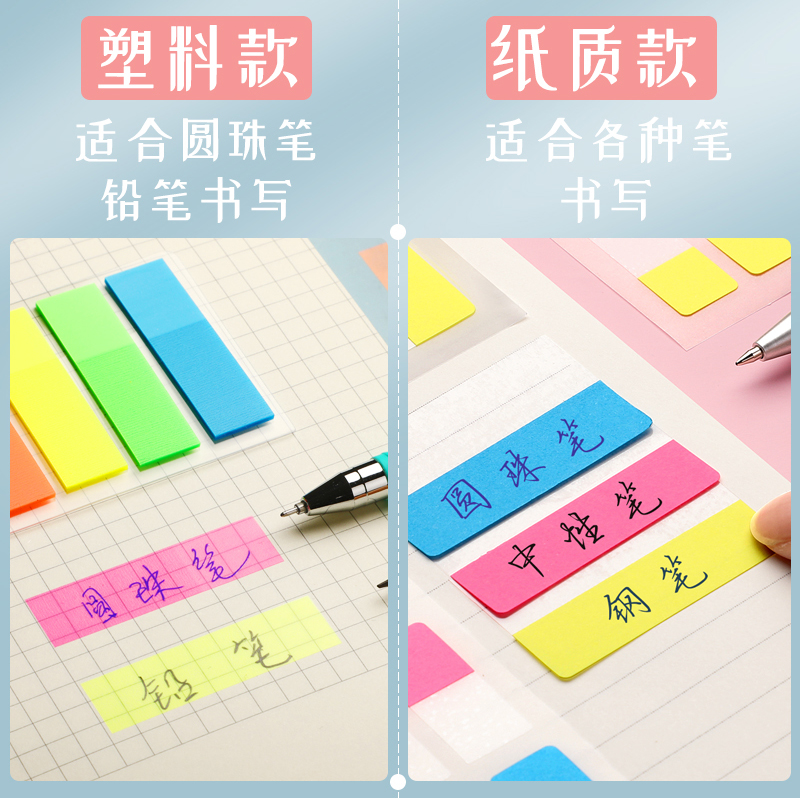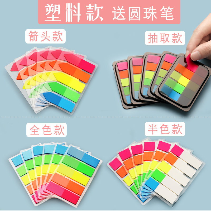 Label stickers, index stickers, convenience stickers, bright colors, writeable labels, plastic strips, office document classification, students with transparent fluorescent color indicating page number color strips, easy to tear, easy to stick and not to hurt the paper