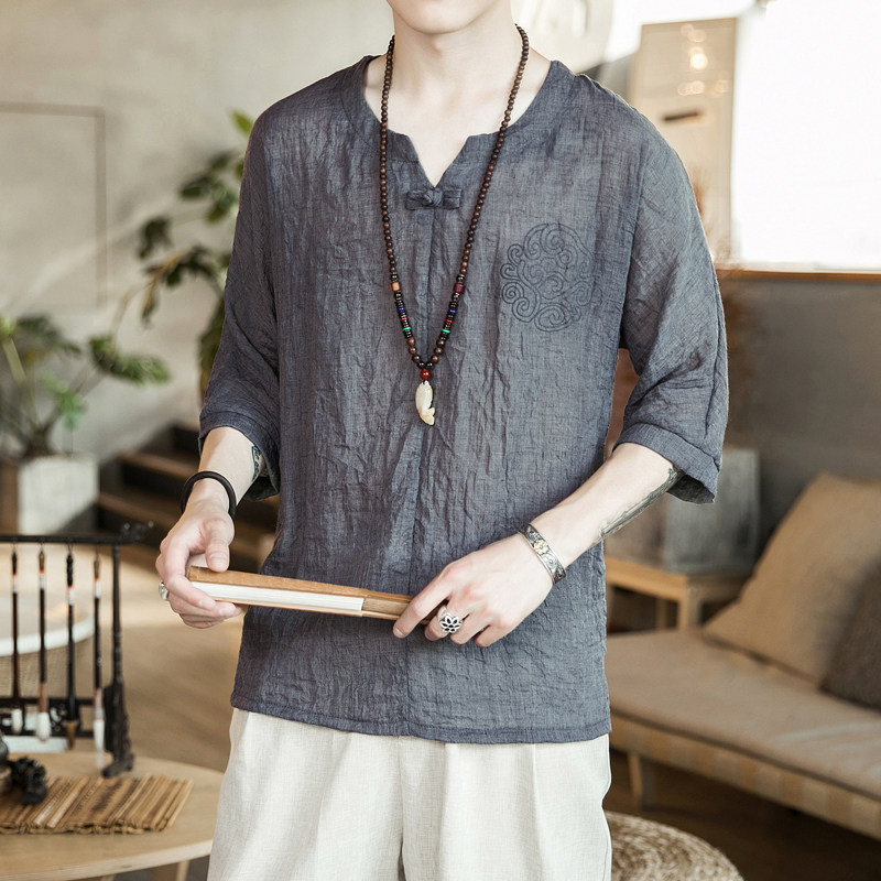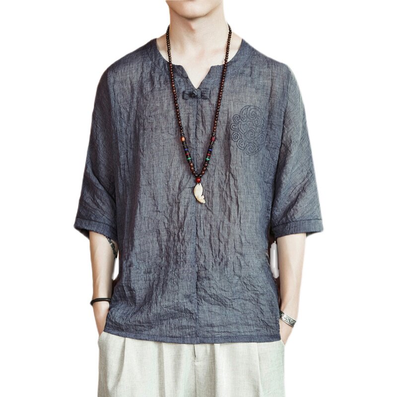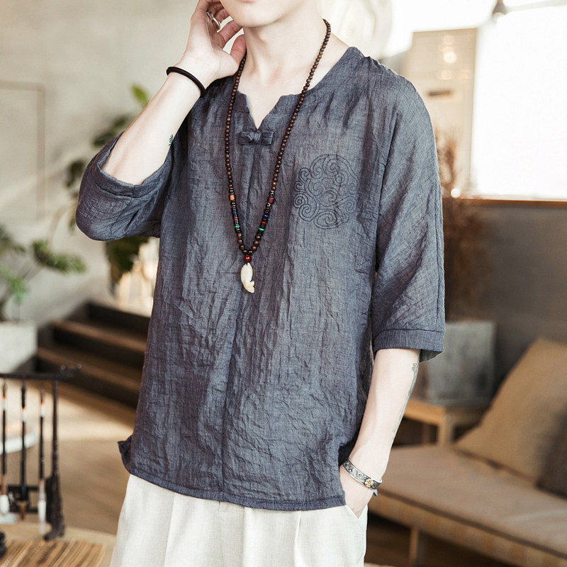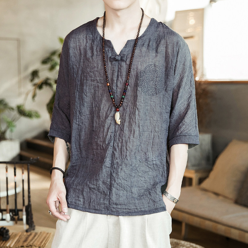 Linen short-sleeved T-shirt men's summer thin men's casual clothes trend loose Chinese style seven-point sleeve men's clothing