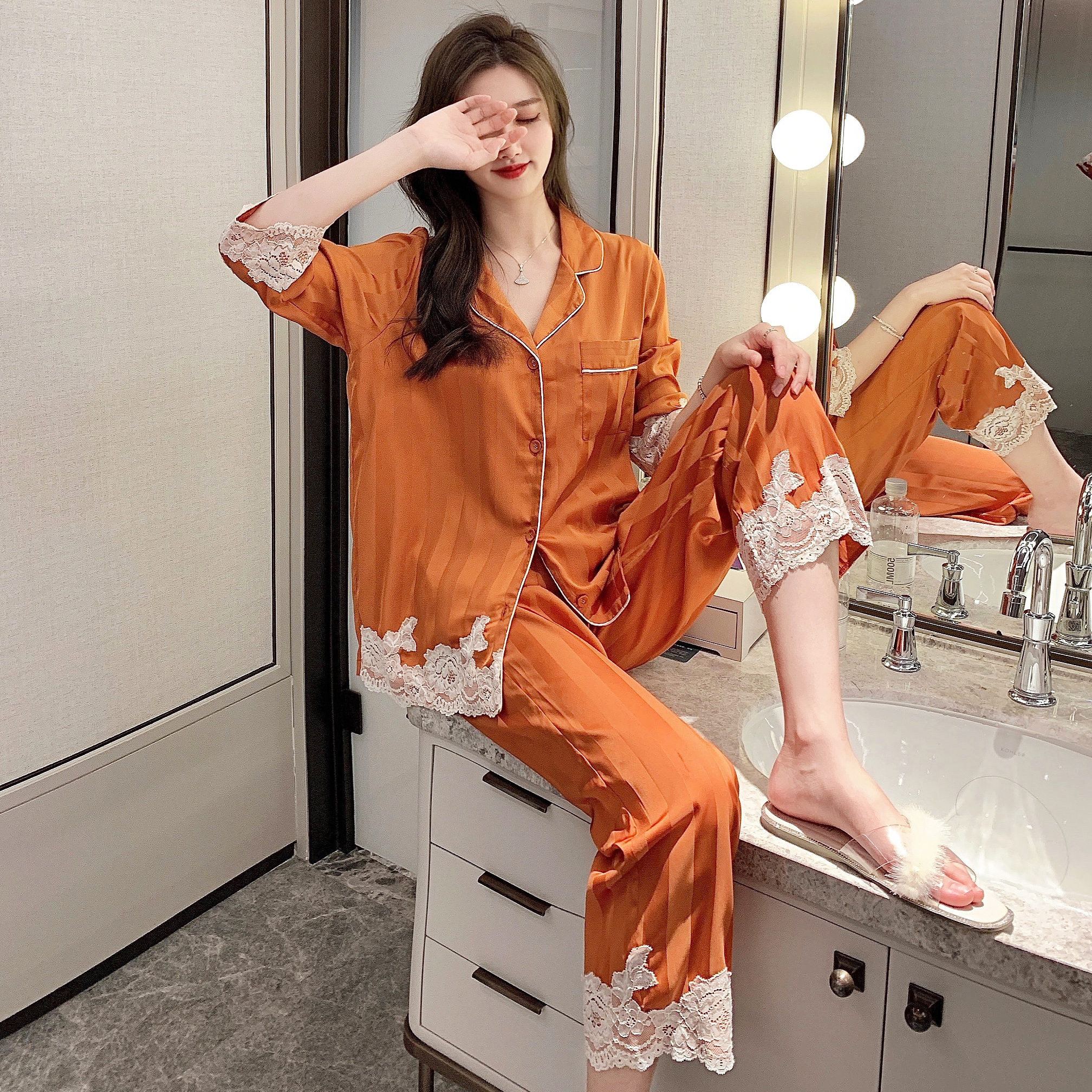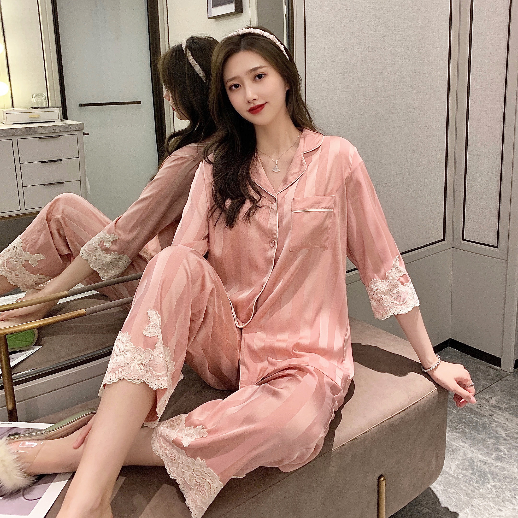 CHAO loves beauty and greasy lace~ VIRRI CIAGA three quarter sleeve jacquard striped fashion pajamas for women summer