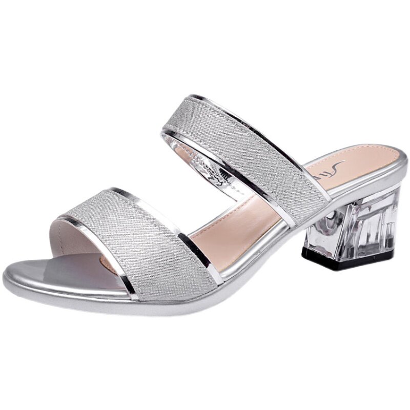 Popular mid-heel slippers women's summer outer wear 2021 new fashion all-match crystal thick heel leather ladies large size sandals