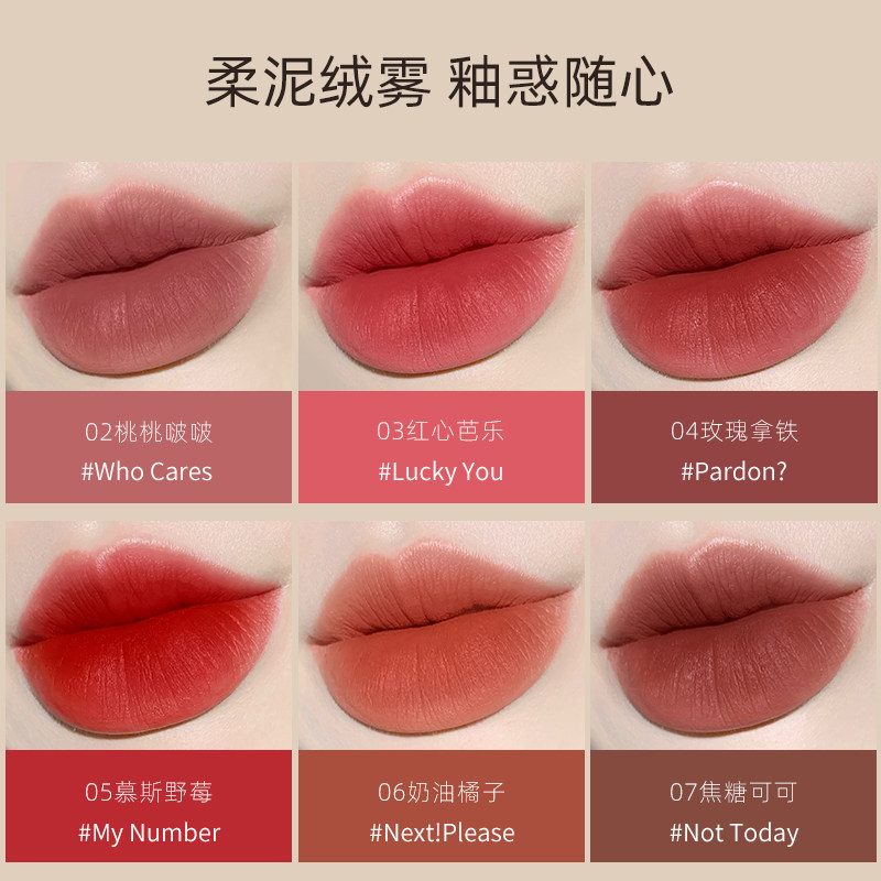 02 Peach Peach Bobo Who cares 03 Red Heart Guava Lucky you 04 Rose Latte Pardon? 05 Mousse Wildberry My nu