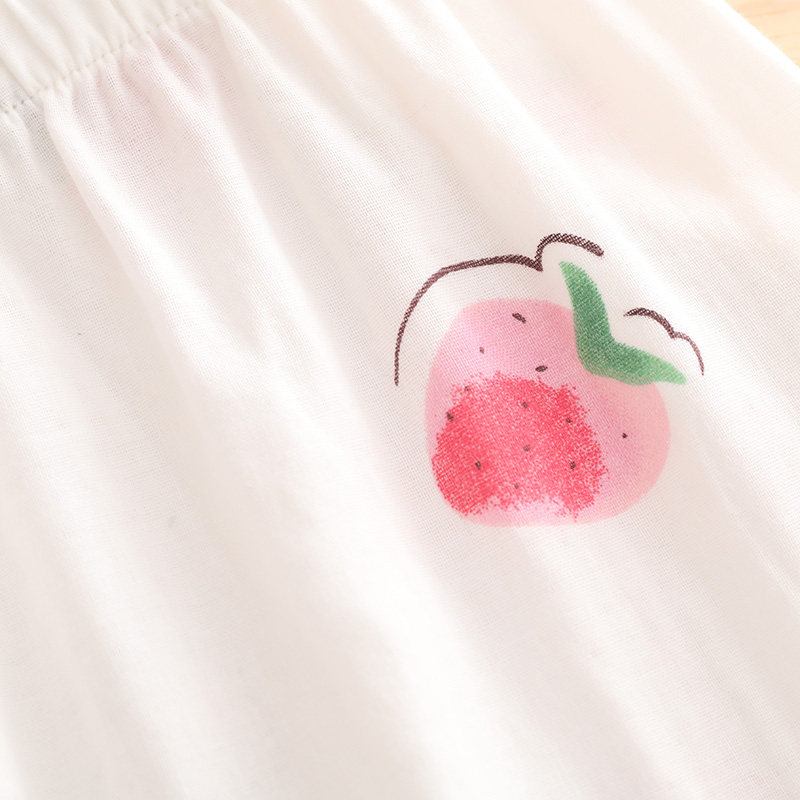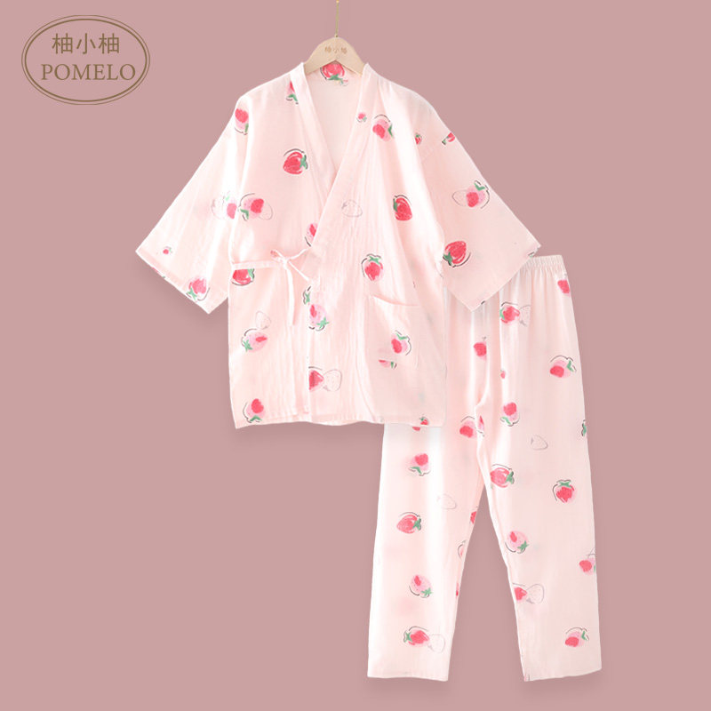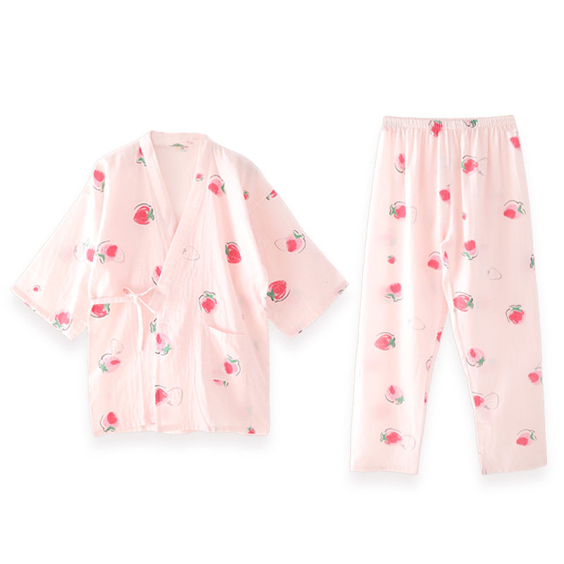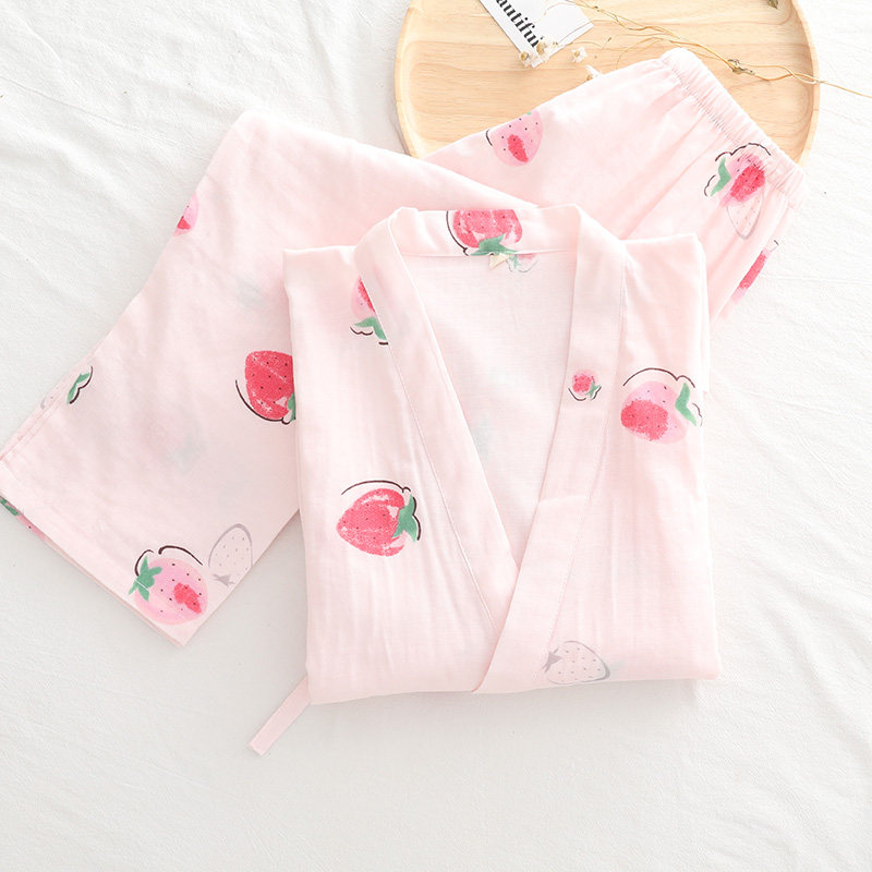 Summer thin cotton gauze ins Japanese strawberry loose short-sleeved trousers cotton kimono pajamas home service set women