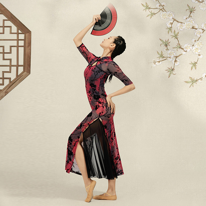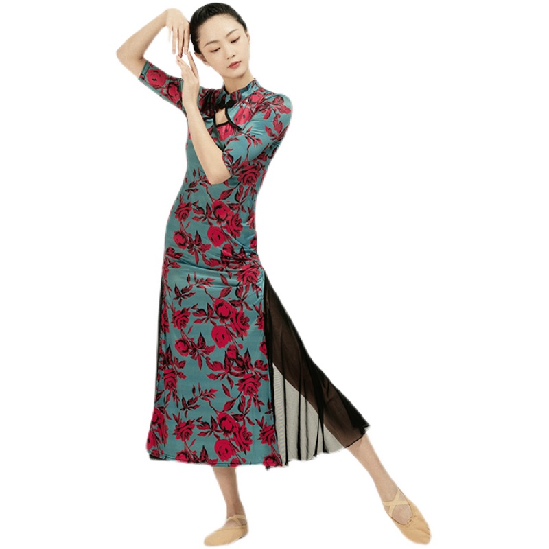 Oriental folk cheongsam classical Han style folk dance practice costume ice silk printing plate buckle slim dress