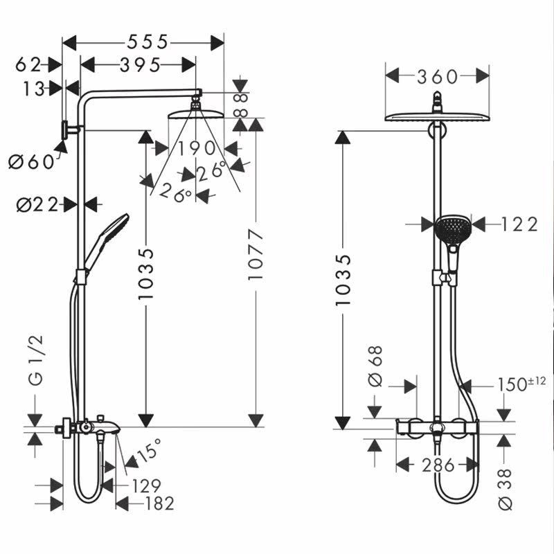 Hansgrohe26162007 flying rain E360 shower pipe with thermostatic bathtub tap shower sleeve