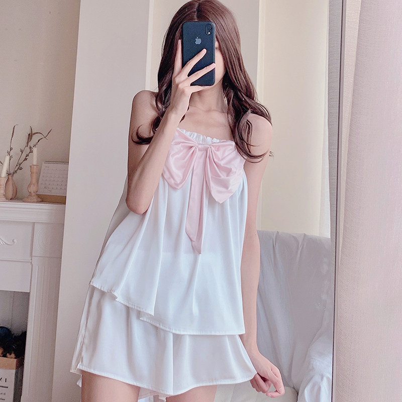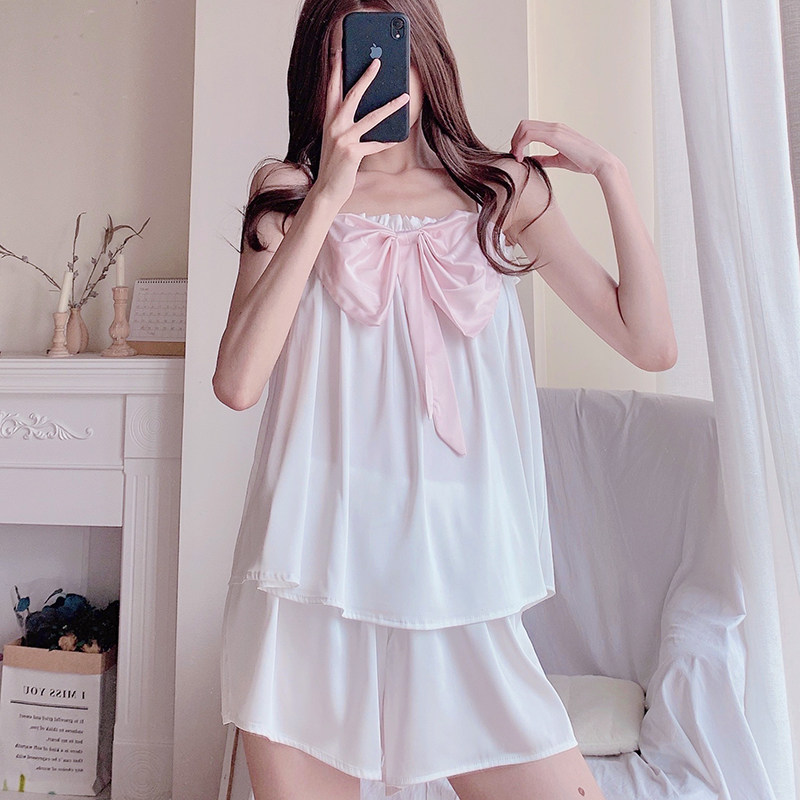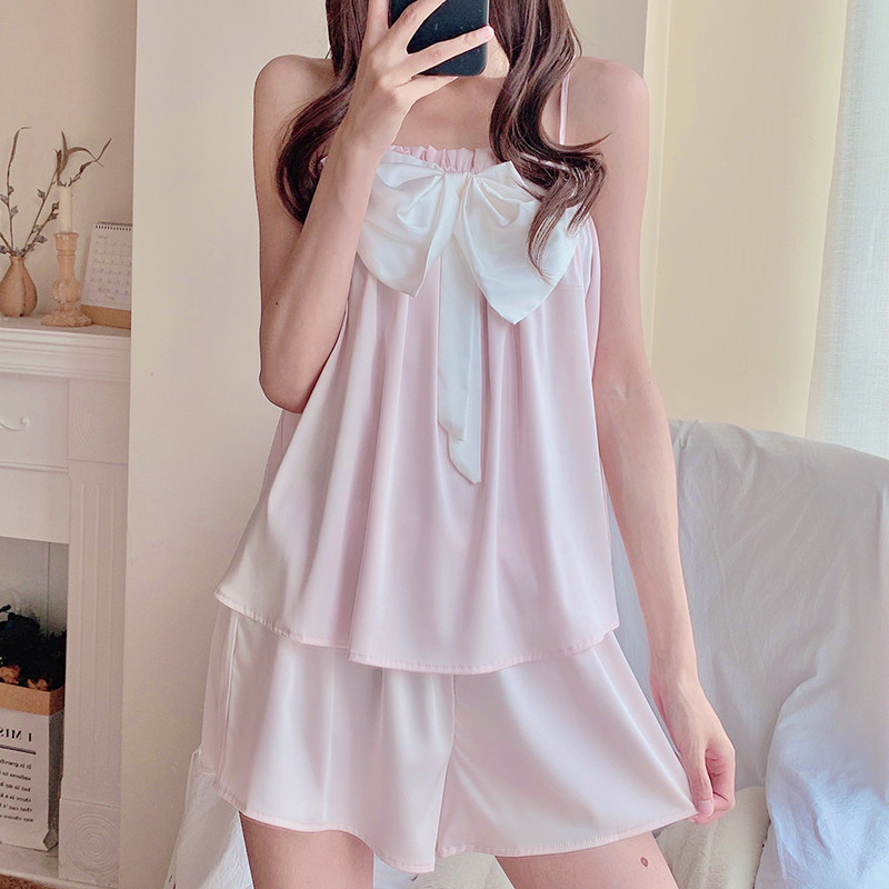 Pajamas girls summer ice silk bow suspenders shorts two-piece suit thin cute Japanese sweet home clothes
