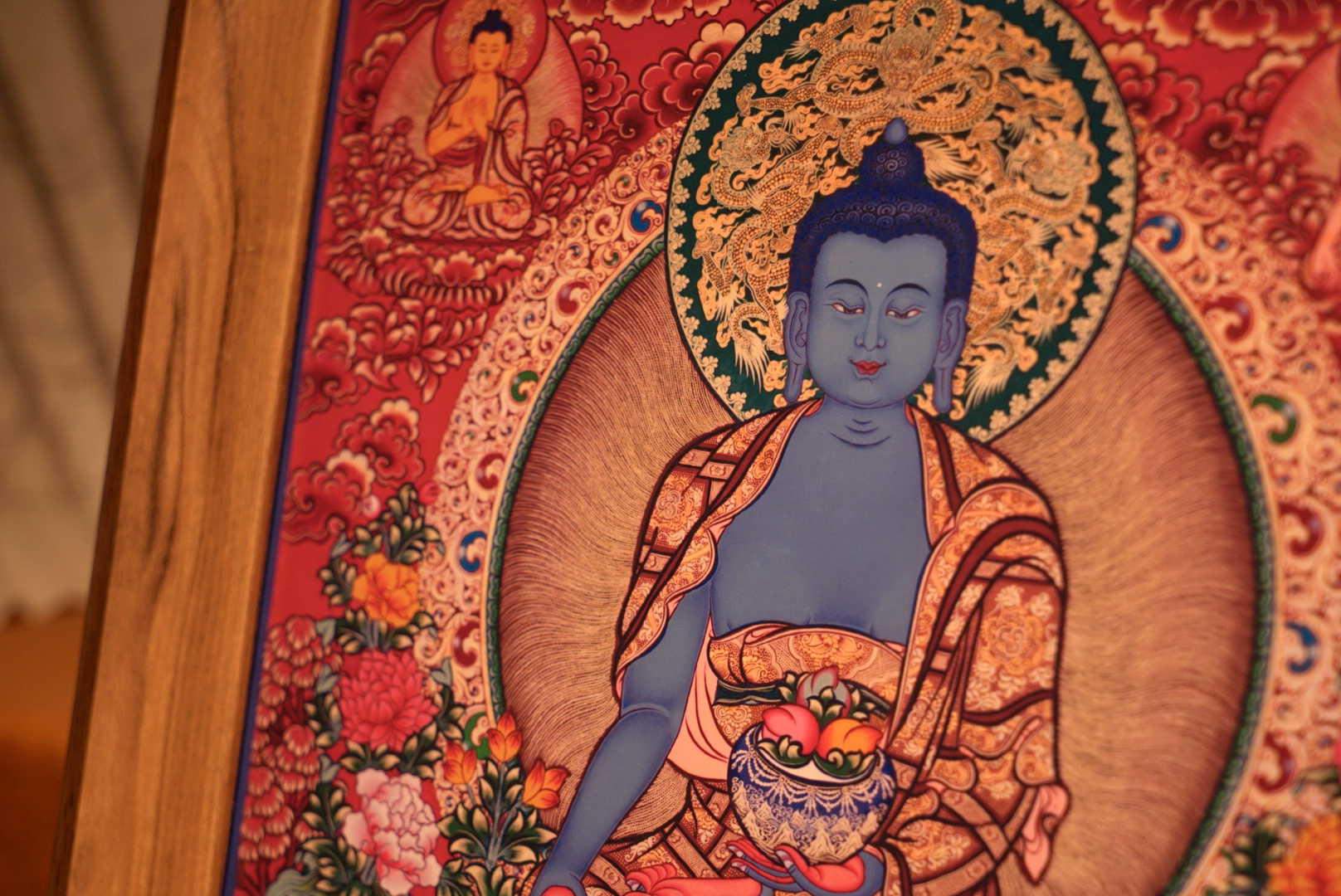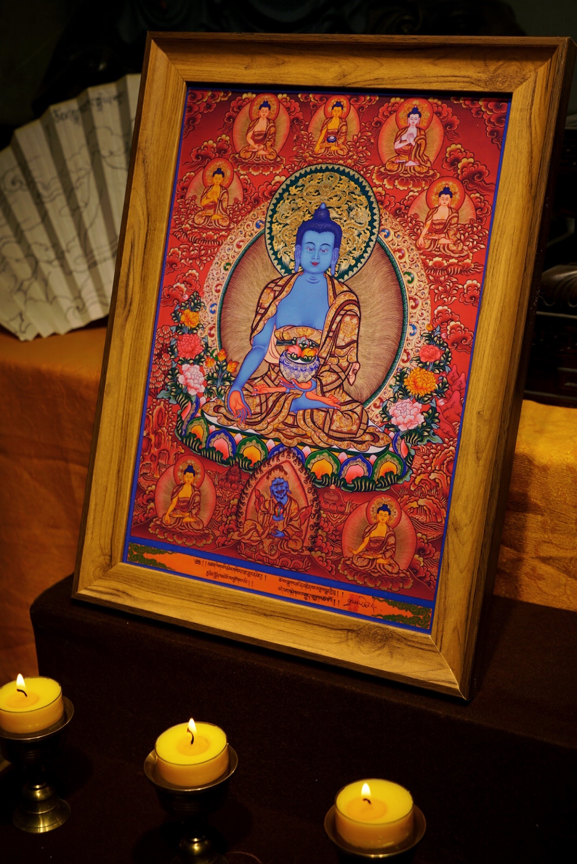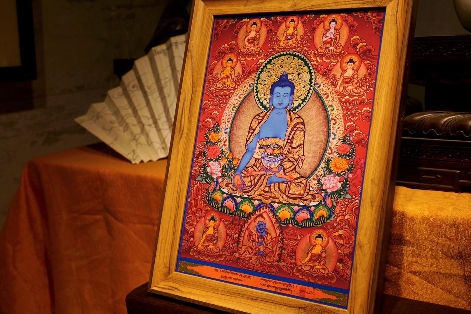 High-quality original re-engraved color printing works Regong painting school red convex gold thangka·pharmacist Buddha·table