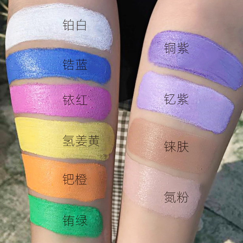 Platinum White Iridium Red Palladium Orange Hydrogen Turmeric Green Zircons Blue Yttrium Red Copper Purple Rhenium Skin powder