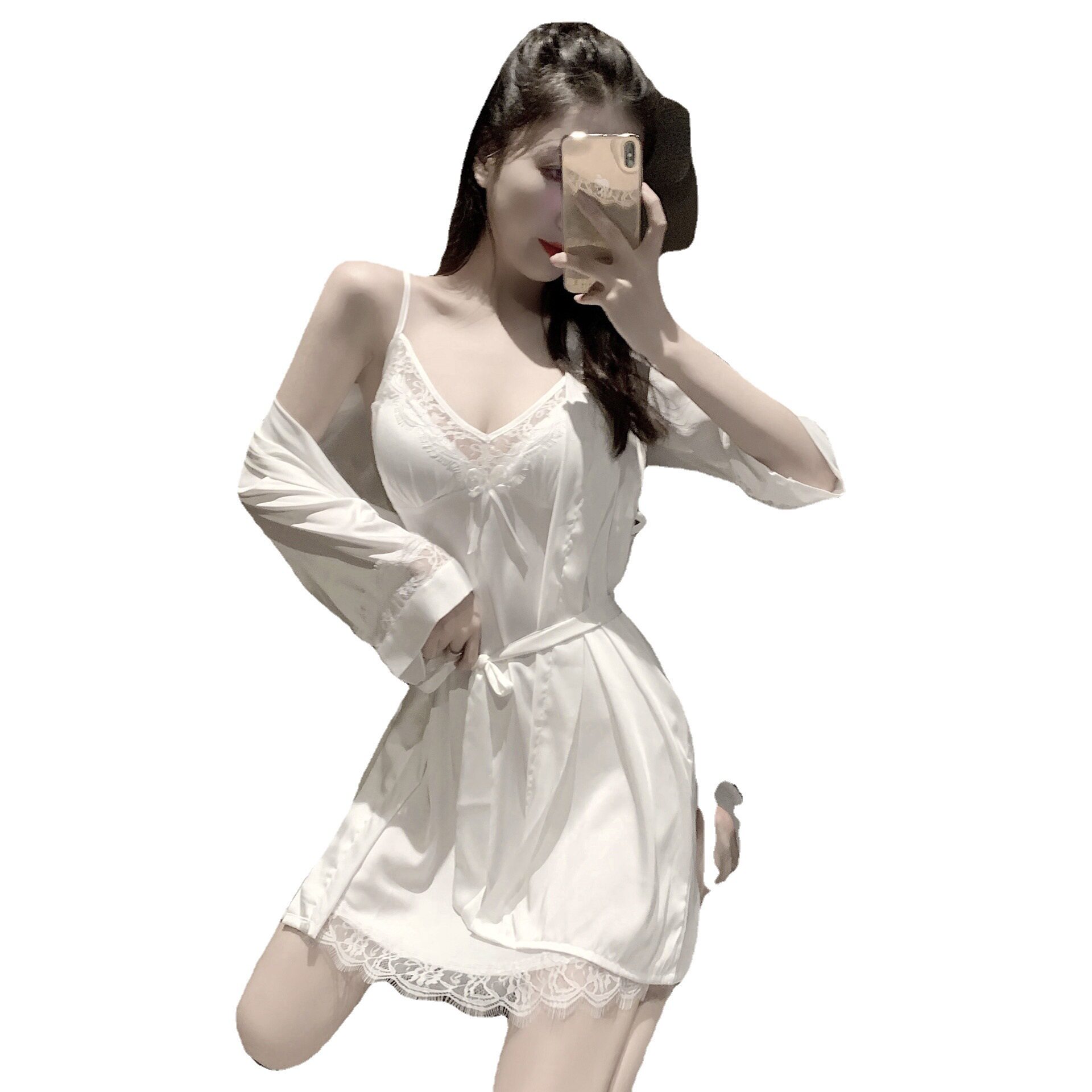 Pajamas women's thin V-neck sexy lace suspender dress nightgown two-piece silk white French romantic nightdress IB