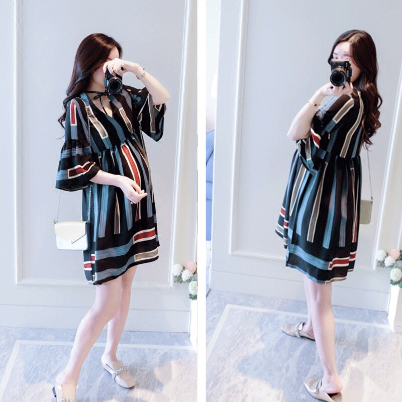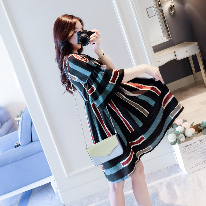 Pregnant women high waist V-neck dress summer new 2021a version top short-sleeved fashion trendy hot mom personality stripes