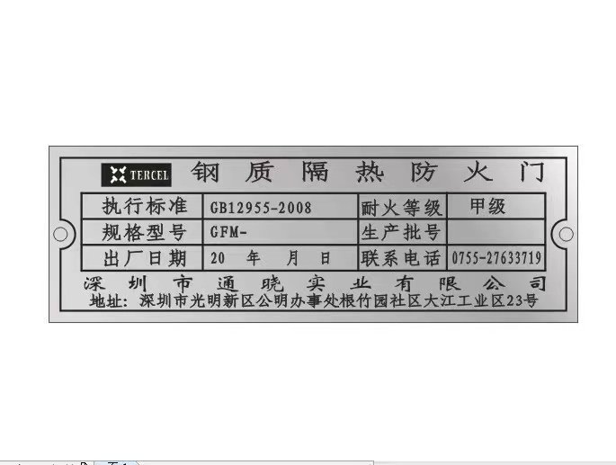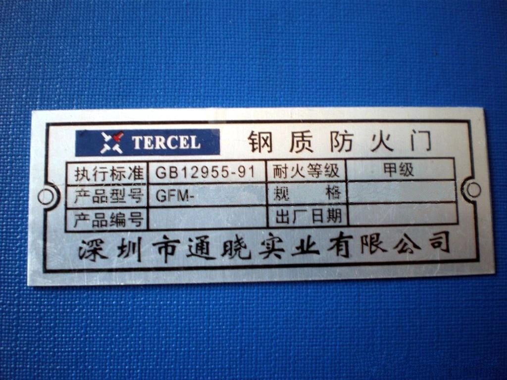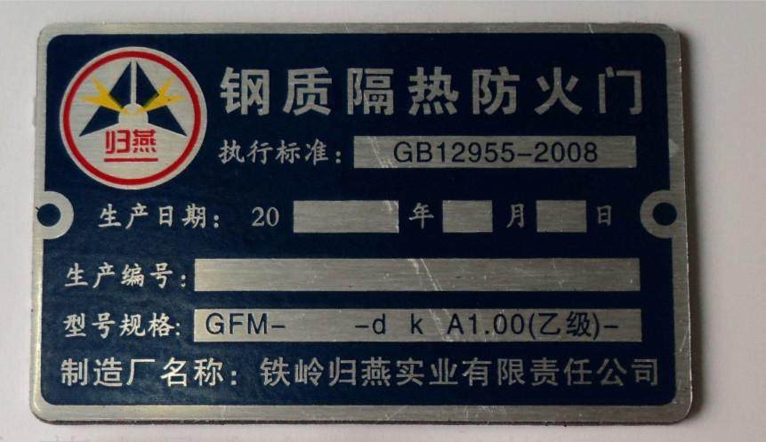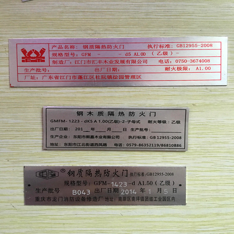 Insulation fire door factory nameplate custom aluminum sign A, B and C grade steel wood fire door shutter door plate