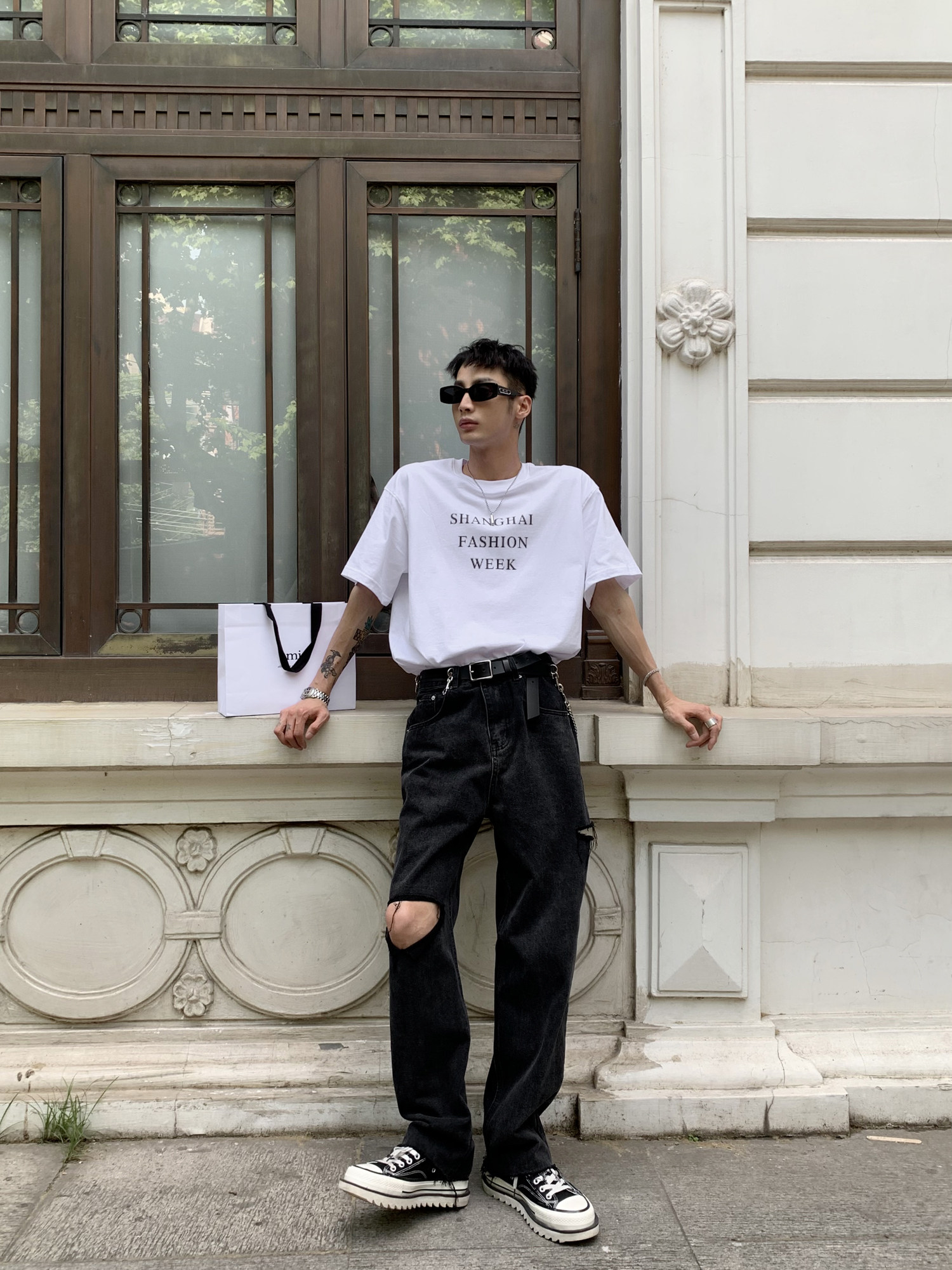 HOZI Summer loose straight drum small crowddesign wool edge dark black Broken Hole Jeans Male Tide Break and Pants Long Pants
