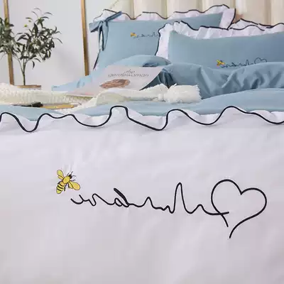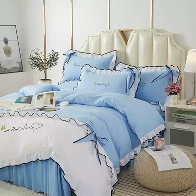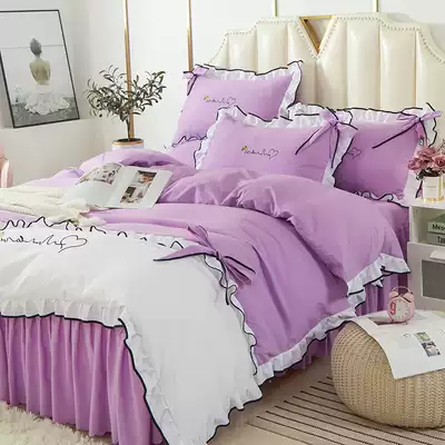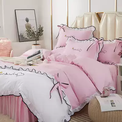 Korean ins Net Red Girl bow knot bed skirt four-piece wash cotton super soft solid color lace princess powder bed sheet 3