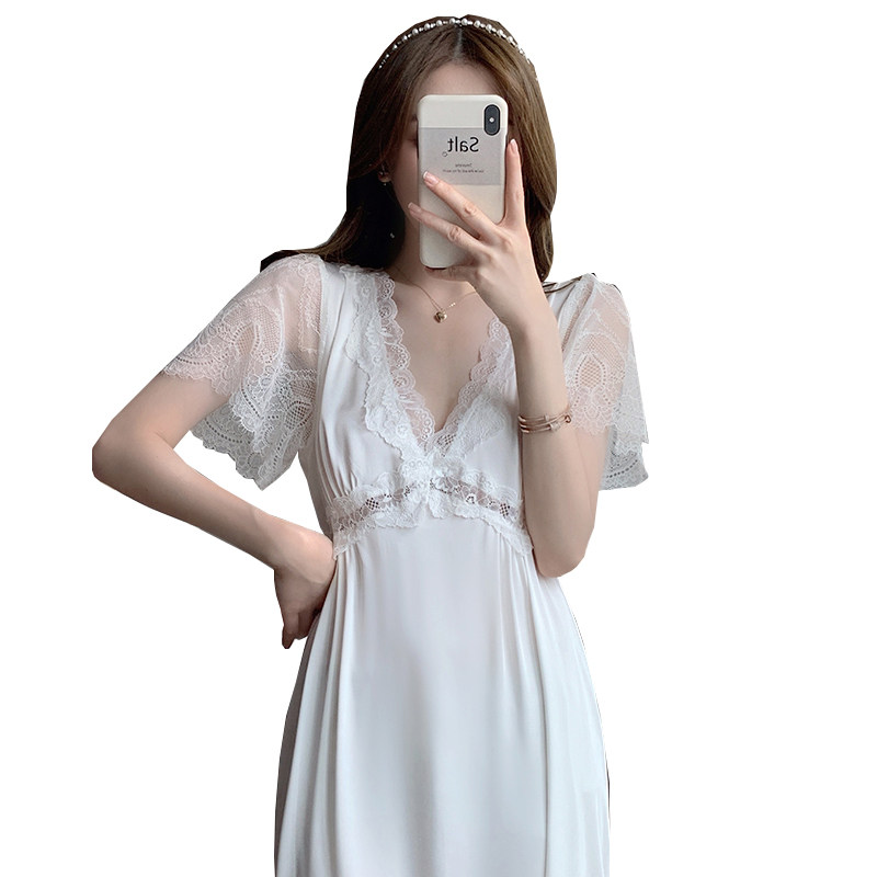 French style sexy lace nightdress women's summer ice silk short-sleeved pajamas net red white luxury palace silk home service