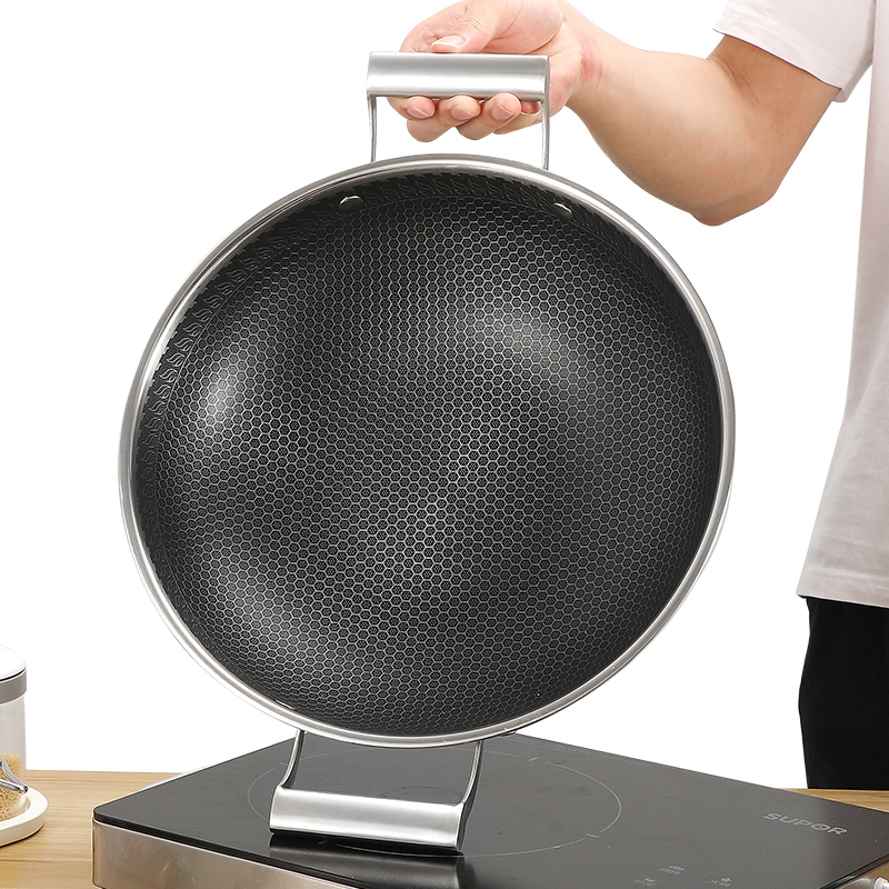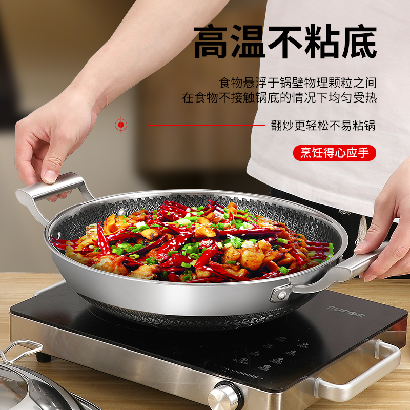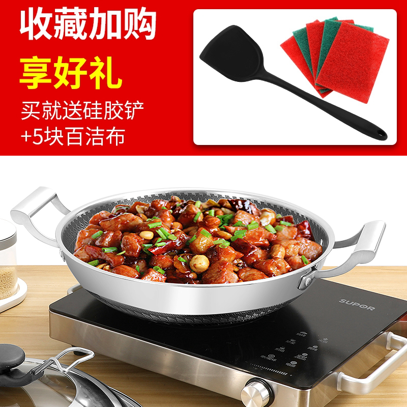 304 stainless steel frying pan without dipping into the pan household double ear round bottom 32-42cm frying pan gas cooker universal