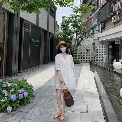 77store crochet flower white dress female summer French bubble sleeve V collar hollow embroidery tea break doll dress