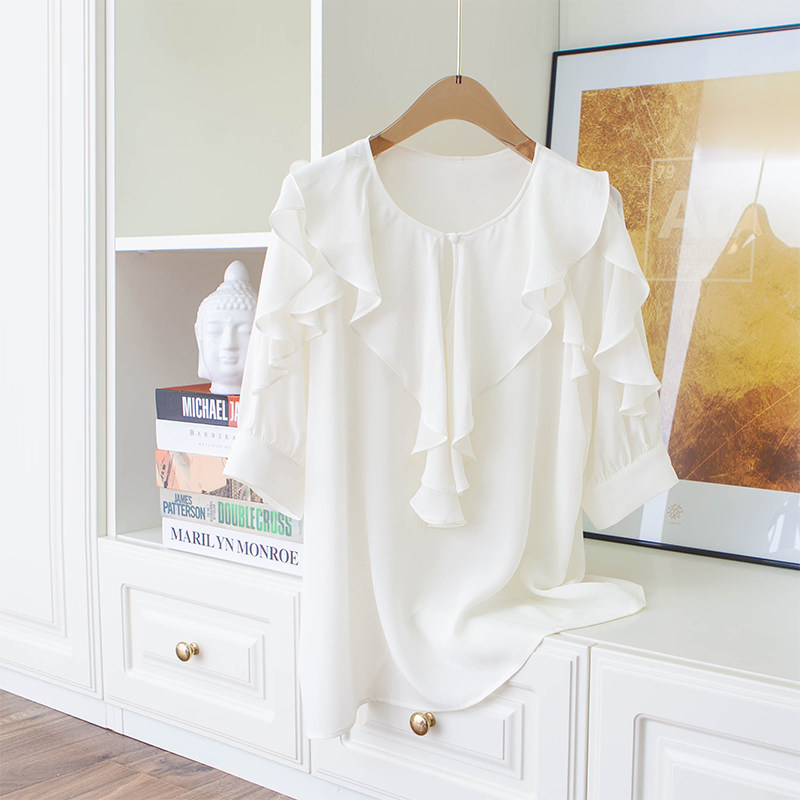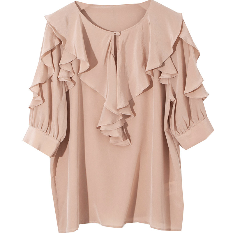 Sweet and touching layers of lotus leaf lace decorated cool and double crepe genuine silk round collar 50% sleeves shirt woman 22 summer blouse