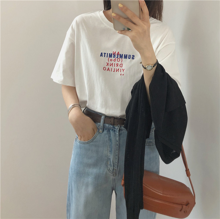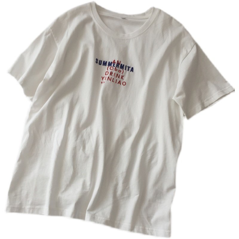 Japan SLY2021 Summer Coloured Embroidered Letters Short Sleeve T-shirt Woman Loose 100 Lap Collar Blouse